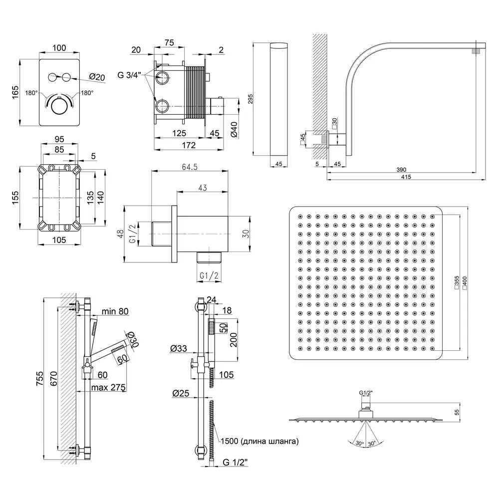 Змішувач, Душова стійка, Кронштейн для ручного душу, Лійка для ручного душу, Душовий шланг, Підключення шлангове, Кронштейн для верхнього душу, Лійка для верхнього душу, Кріплення