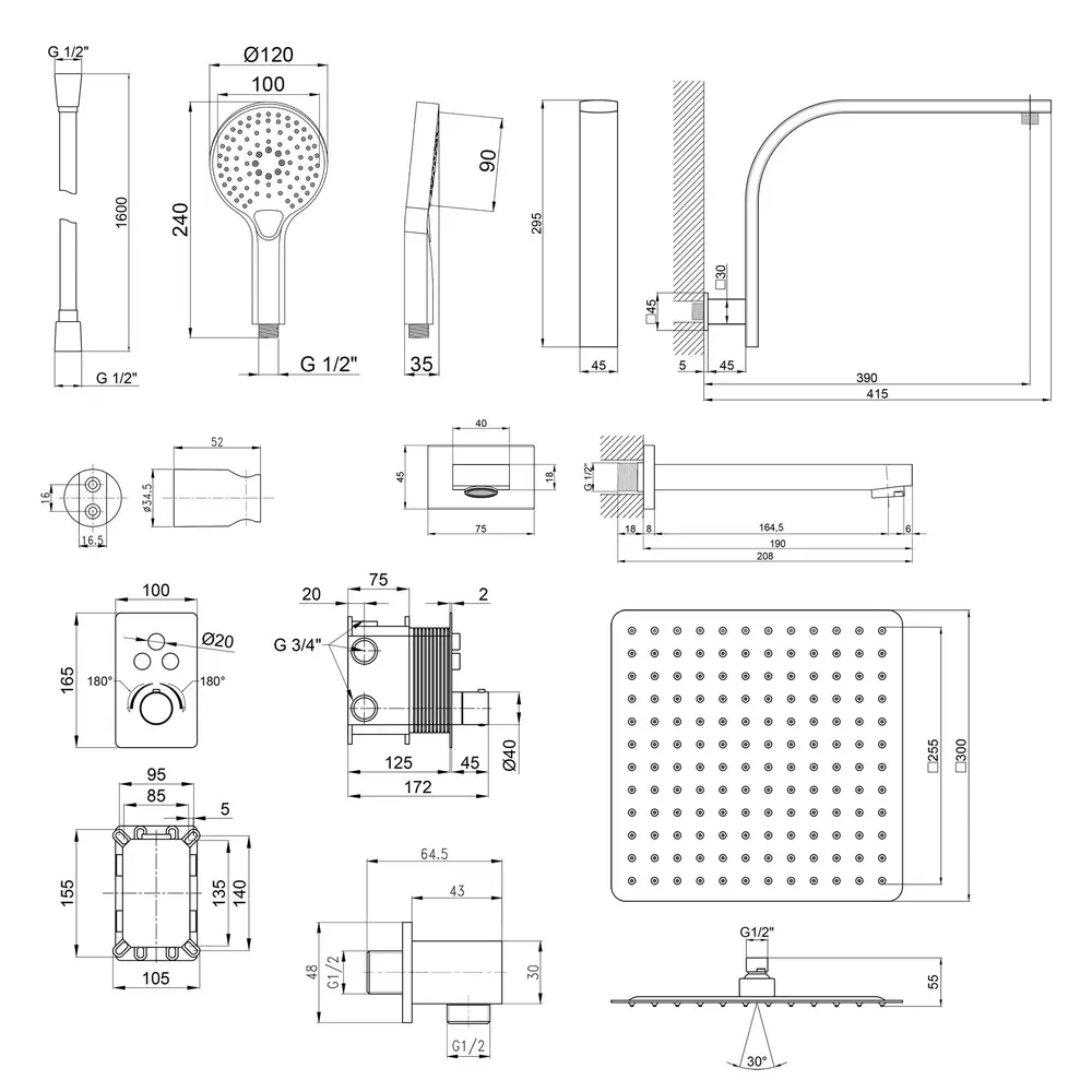 Змішувач, Кронштейн для ручного душу, Лійка для ручного душу, Душовий шланг, Підключення шлангове, Кронштейн для верхнього душу, Лійка для верхнього душу, Вилив, Кріплення