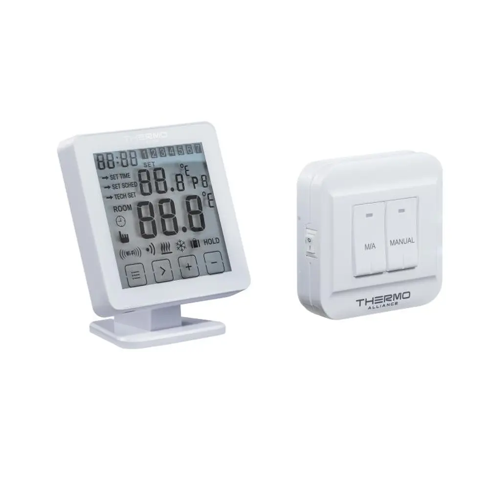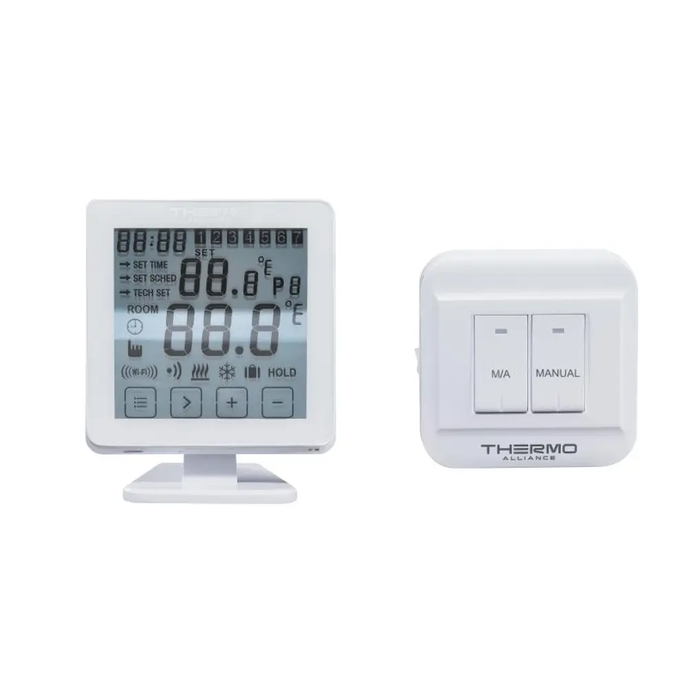 Тижневий програмований термостат Thermo Alliance ТА-2701Wi-Fi RF має два блоки: блок управління опалювальним приладом (увімкнення/вимкнення) та блок кімнатного термостата, він використовується як графічний інтерфейс користувача для визначення та контролю температури в приміщенні. Обидва блоки підтримують зв‘язок радіочастотами (RF). Функція "Wi-Fi" дозволяє дистанційно керувати пристроєм за допомогою мобільного додатка ThermoAllianceSmart.