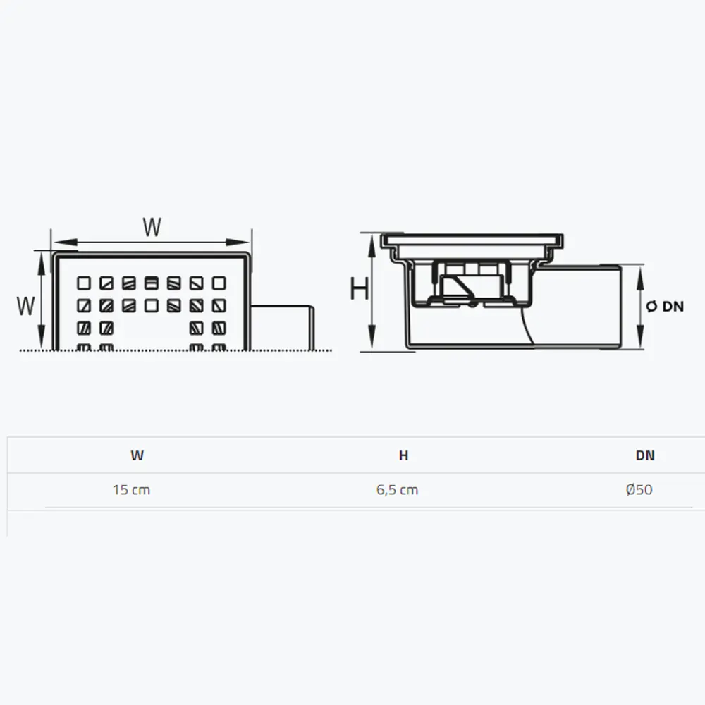 TM213-TILLO Трап пласт., решітка нерж.150х150, горизонт. DN 50,сухий затвір(поворотній), Туреччина