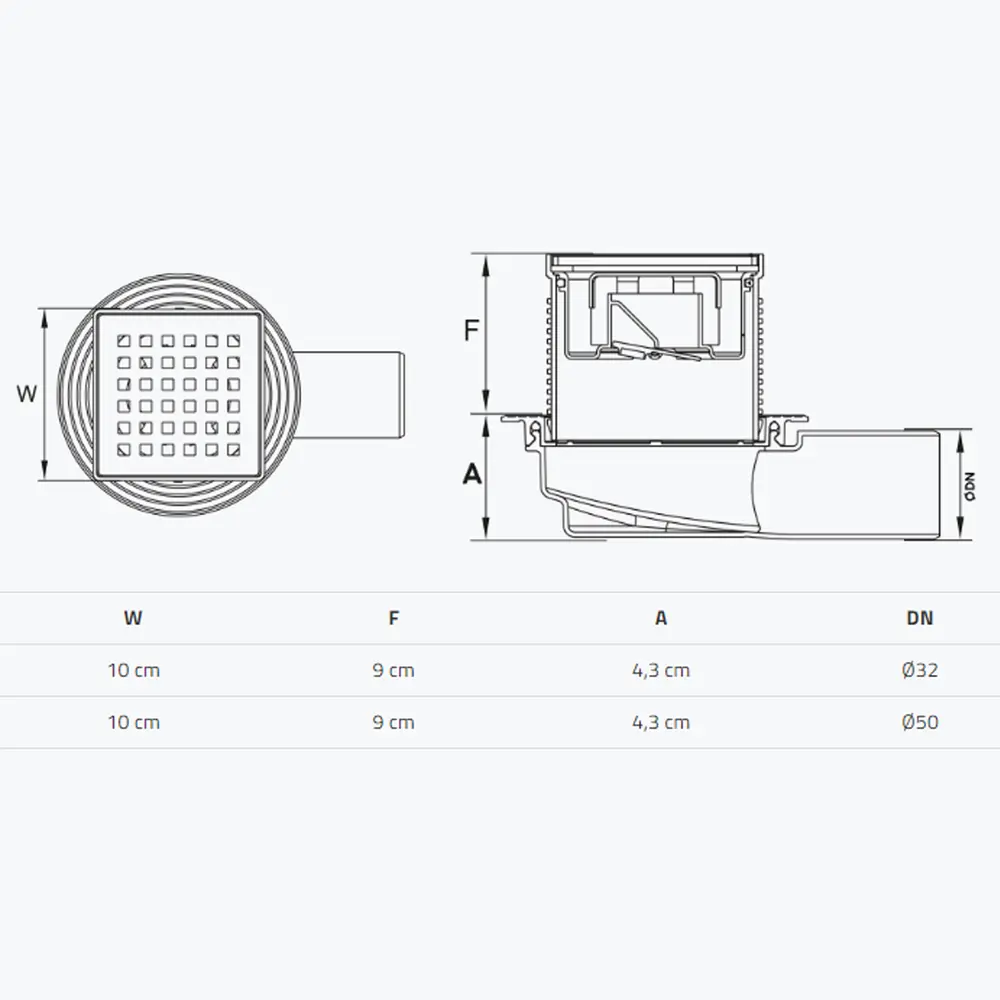TM421-TILLO Трап з сухим затвором DN50, нерж,решiтка 100*100 гориз,з фланцем,Туречччина