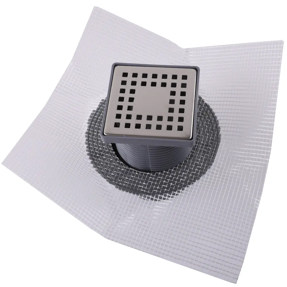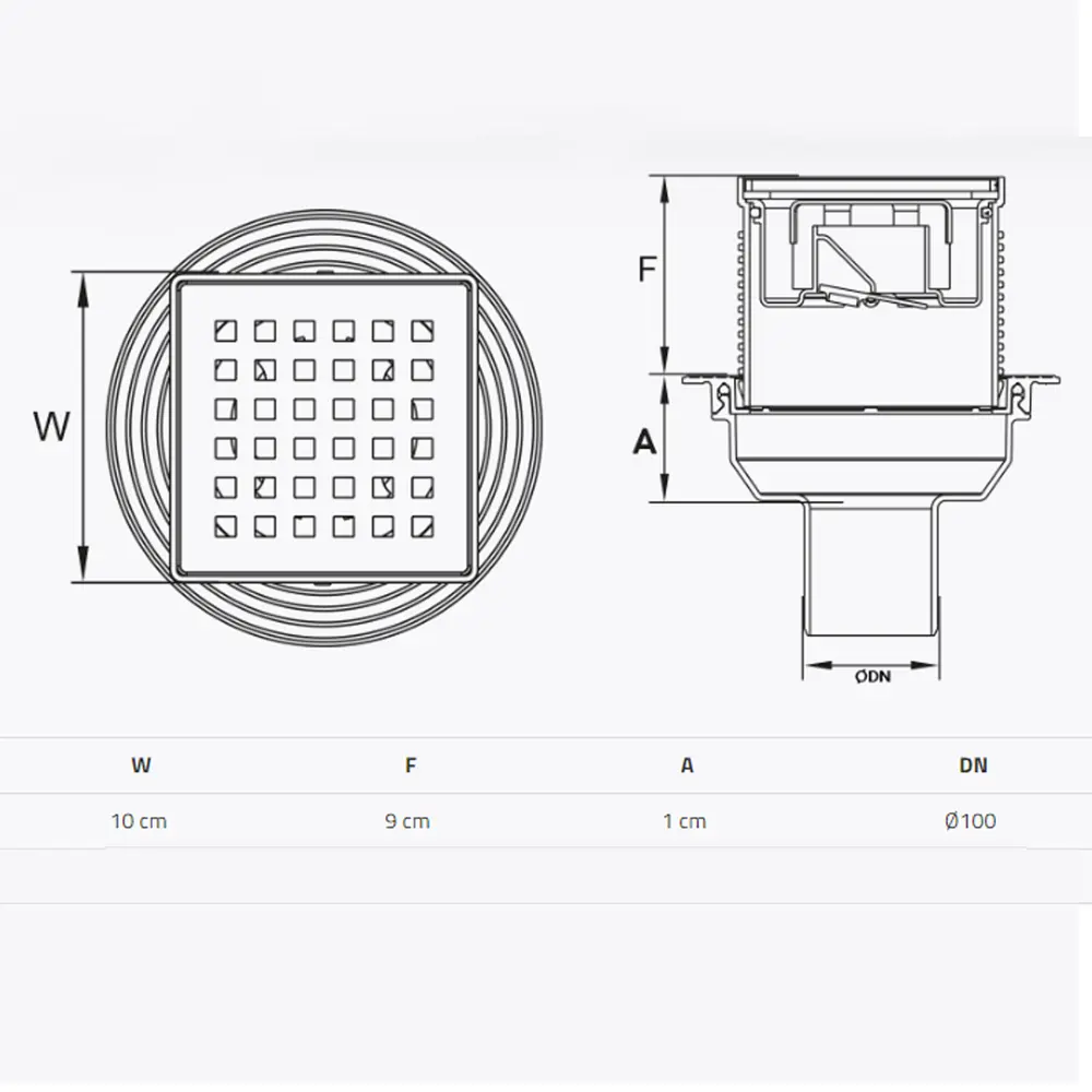 TM424-TILLO Трап з сухим затвором DN100, нерж,решiтка 100*100 Вертик,з фланцем,Туречччина
