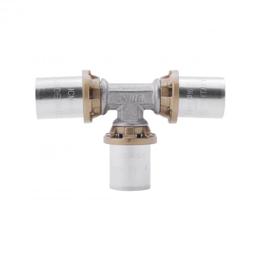 Прес-фітинг трійник Sempiter призначений для металопластикової труби для монтажу з радіальним пресуванням. Застосовується в системах водопостачання, опалення, і охолодження. Окремий прес на кожен діаметр труби стискає гільзу з нержавіючої сталі, яка надійно фіксує трубу на фітингу. Механічне з‘єднання забезпечує спеціальний профіль фітинга і гільзи з нержавіючої сталі, які були розроблені спеціально для того, щоб пресування відбувалося трьома різними профілями.