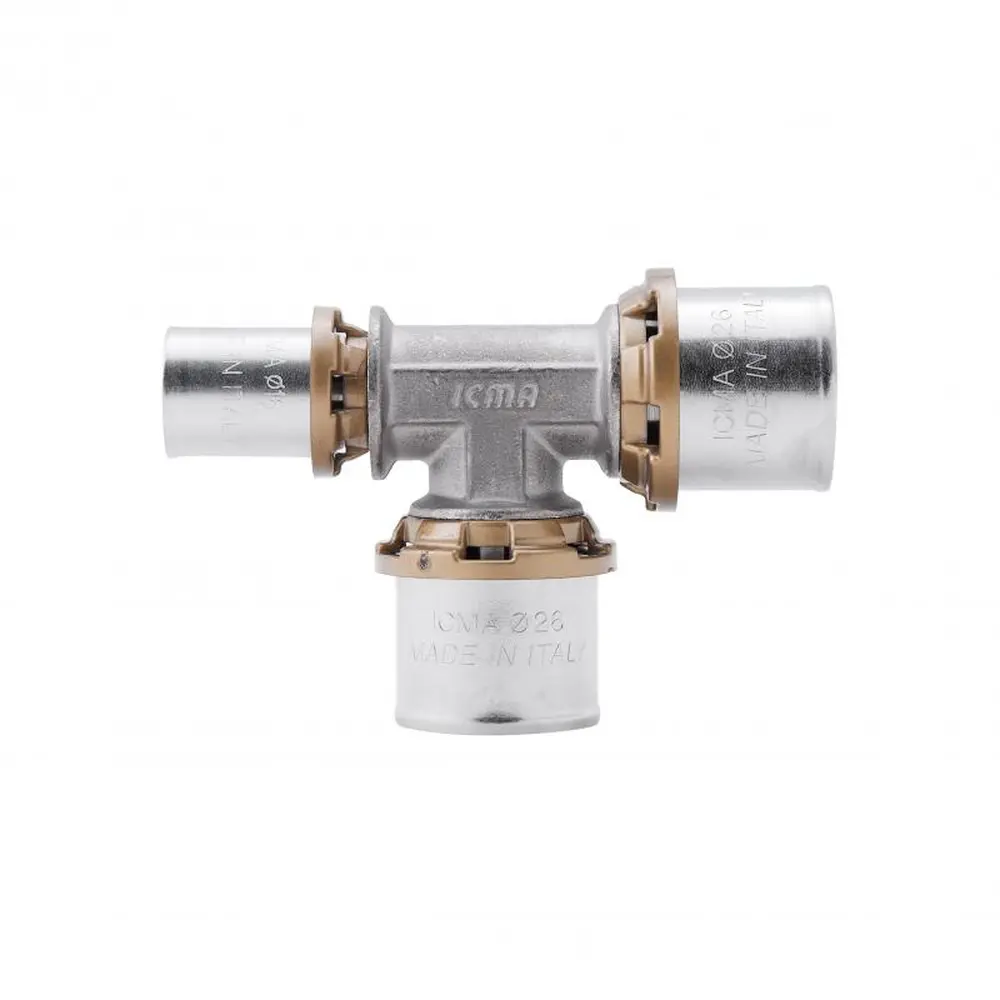 Прес-фітинг трійник Sempiter призначений для металопластикової труби для монтажу з радіальним пресуванням. Застосовується в системах водопостачання, опалення, і охолодження. Окремий прес на кожен діаметр труби стискає гільзу з нержавіючої сталі, яка надійно фіксує трубу на фітингу. Механічне з‘єднання забезпечує спеціальний профіль фітинга і гільзи з нержавіючої сталі, які були розроблені спеціально для того, щоб пресування відбувалося трьома різними профілями.