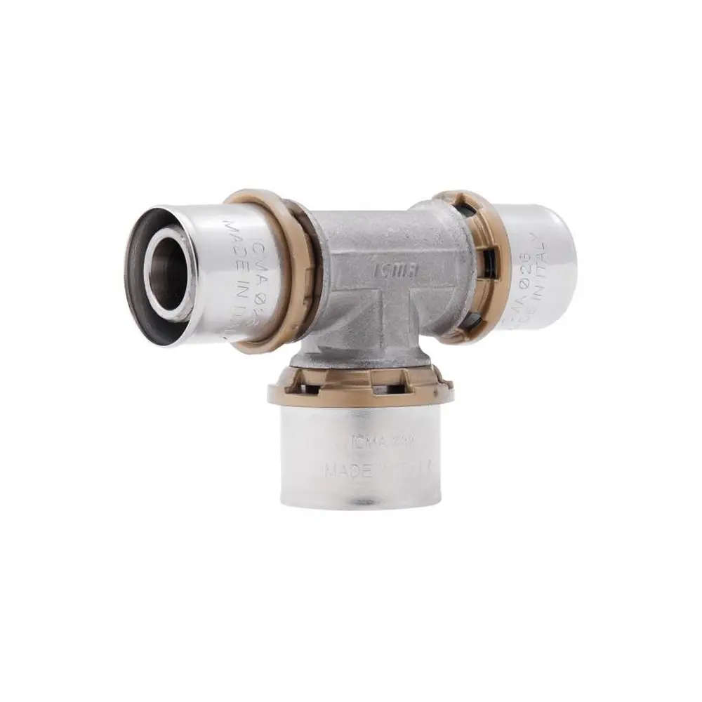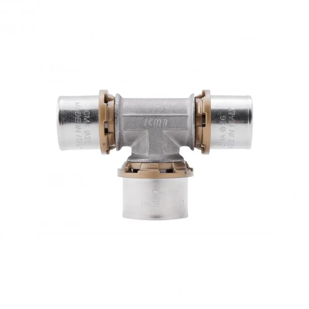 Прес-фітинг трійник Sempiter призначений для металопластикової труби для монтажу з радіальним пресуванням. Застосовується в системах водопостачання, опалення, і охолодження. Окремий прес на кожен діаметр труби стискає гільзу з нержавіючої сталі, яка надійно фіксує трубу на фітингу. Механічне з‘єднання забезпечує спеціальний профіль фітинга і гільзи з нержавіючої сталі, які були розроблені спеціально для того, щоб пресування відбувалося трьома різними профілями.