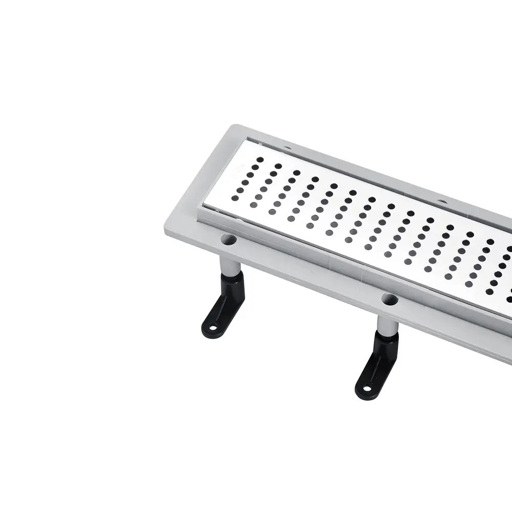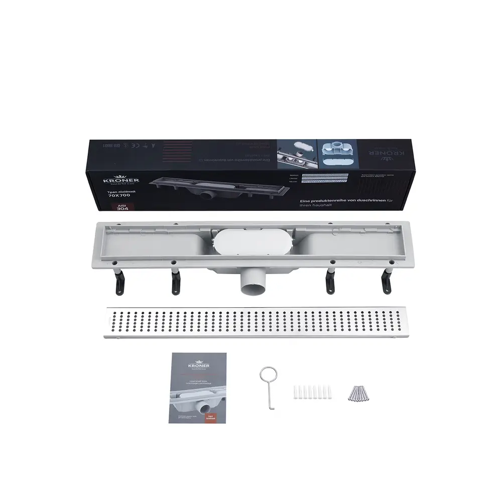 Лінійний трап Kroner KRP Harz L70 Löcher з декоративною решіткою розміром 700х73 мм з нержавіючої сталі, виконує функцію водовідведення з душових кабін без застосування душового піддона, на рівні з підлогою. Корпус трапа виготовлений зі стійкого до агресивних середовищ міцного пластику. Також душовий трап має сухий гідрозатвор діаметром 50 мм, який надійно захистить від проникнення неприємних запахів з каналізаційних труб. Конструкція лотка дає можливість без зайвих труднощів почистити виріб.