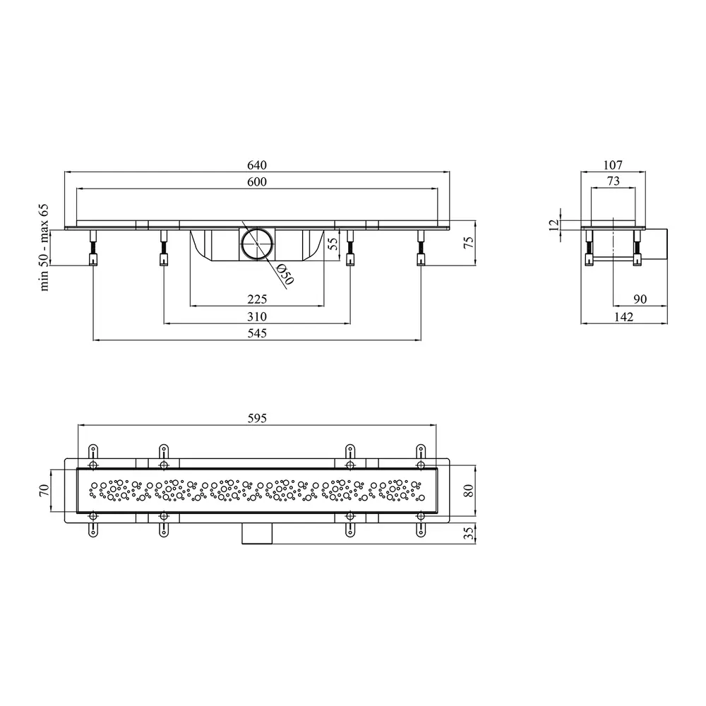 Линейный трап Kroner KRP Harz M60 Muster с декоративной решеткой размером 600х73 мм из нержавеющей стали выполняет функцию водоотвода из душевых кабин без применения душевого поддона на уровне с полом. Корпус трапа изготовлен из устойчивого к агрессивным средам прочного пластика. Также душевой трап обладает сухим гидрозатвором диаметром 50 мм, который надежно защитит от проникновения неприятных запахов из канализационных труб. Конструкция лотка дает возможность без лишних трудностей почистить изделие.