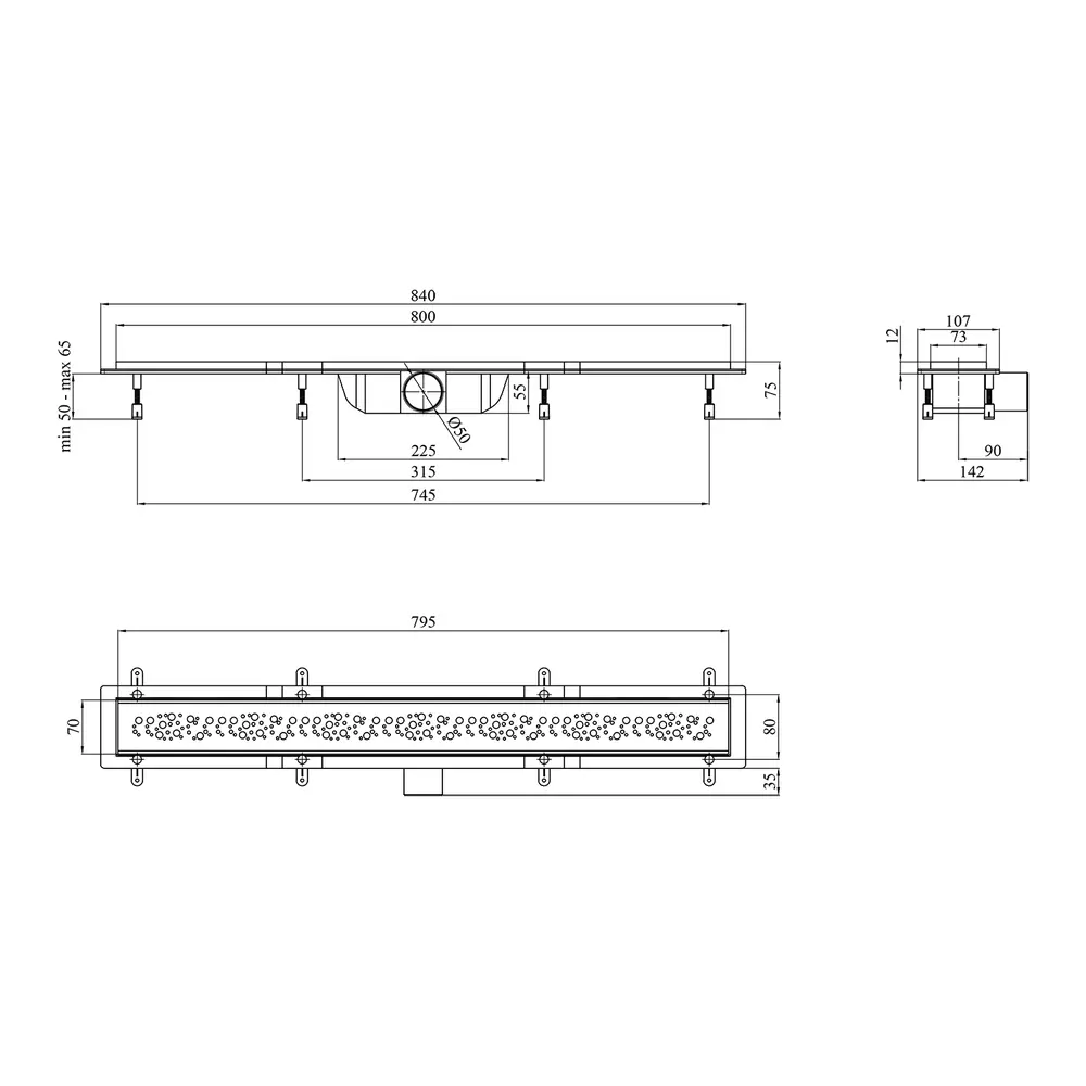 Линейный трап Kroner KRP Harz M80 Muster с декоративной решеткой размером 800х73 мм из нержавеющей стали выполняет функцию водоотвода из душевых кабин без применения душевого поддона на уровне с полом. Корпус трапа изготовлен из устойчивого к агрессивным средам прочного пластика. Также душевой трап обладает сухим гидрозатвором диаметром 50 мм, который надежно защитит от проникновения неприятных запахов из канализационных труб. Конструкция лотка дает возможность без лишних трудностей почистить изделие.