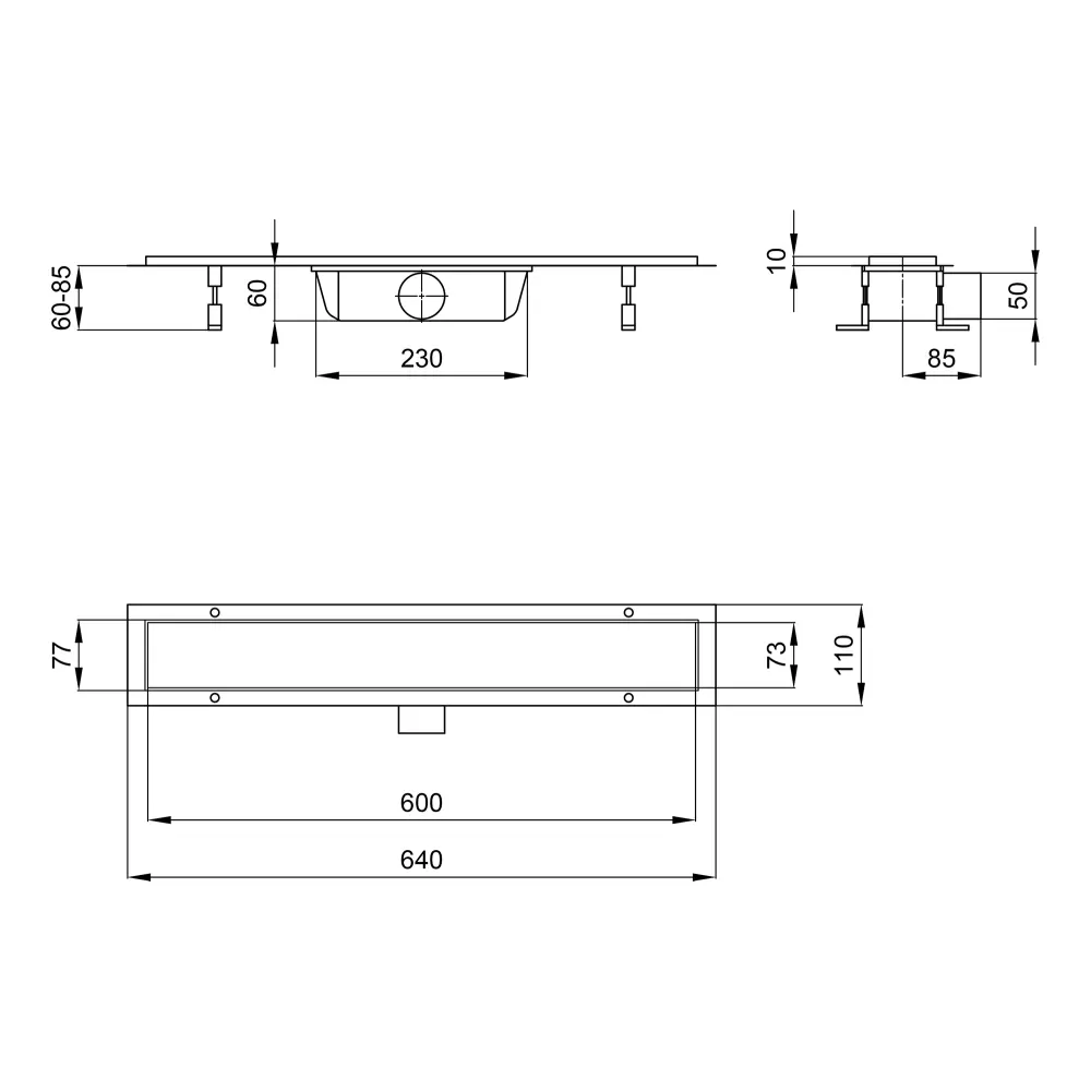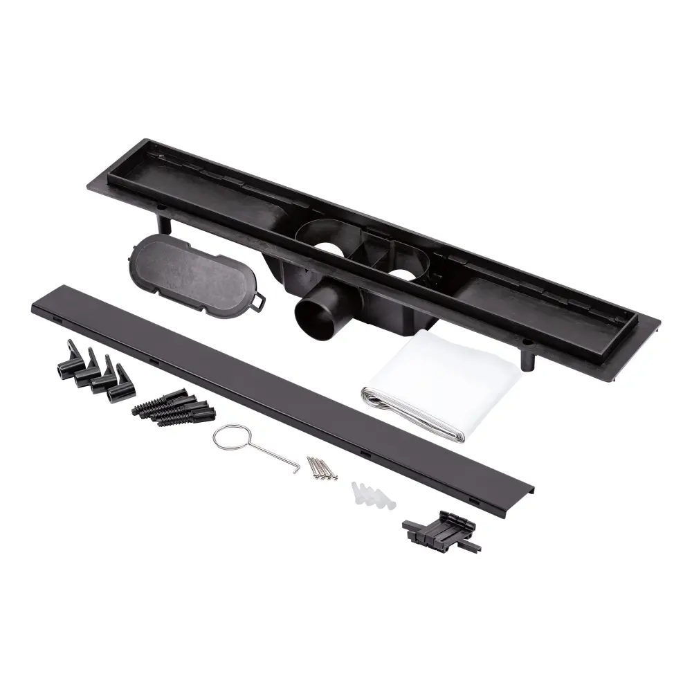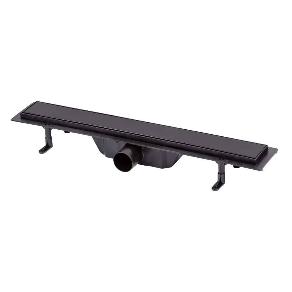 Універсальний лінійний трап Qtap Dry Tile304-600MBLA з двосторонньою накладкою з нержавіючої сталі 600х70. Універсальність полягає в тому, що в жолоб можна покласти свою керамічну плитку, що додасть особливості Вашої ванній кімнаті. Або перевернути накладку і використовувати її іншим боком, чорної матовою поверхнею, яка відмінно впишеться в сучасний дизайн.