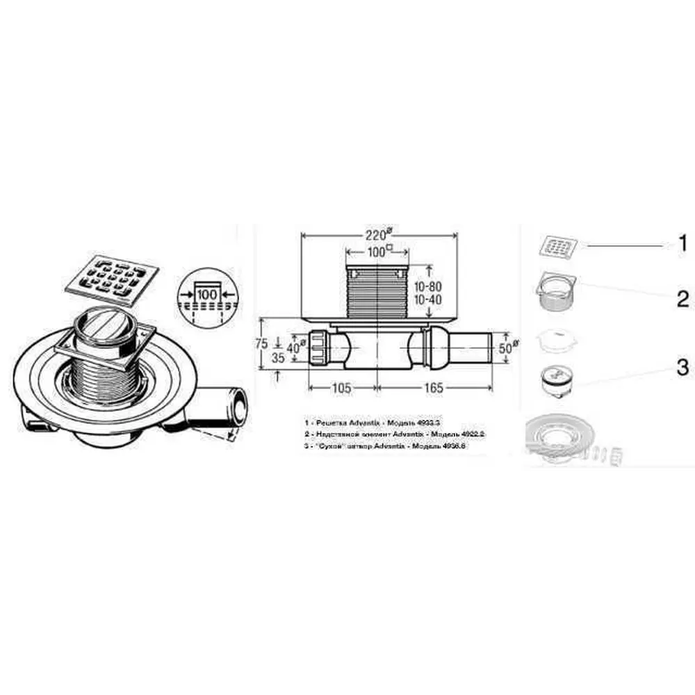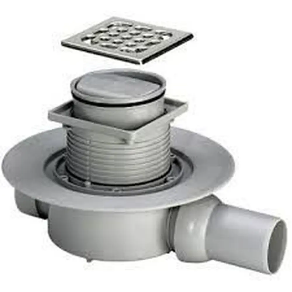 Решітка вироби VIEGA 583217 - полірована нержавіюча сталь розміром 100х100 мм., А корпус виготовлений з міцного, вискококачественного пластика який стійкий до впливу високих температур і побутової хімії. Гідрозатвор в конструкції формується водяним стовпом і запобігає проникненню запахів з каналізації. Горловина трапа регулюється по висоті і щільно прилягає до корпусу вироби на якому розташований фланець для закріплення і нанесення гідроізоляції. Конструкція даного вироби прохідна, що дає можливість підключення інших приладів і забезпечує легкий монтаж. Відведення в каналізаційну трубу стандартного діаметра - 50 мм.