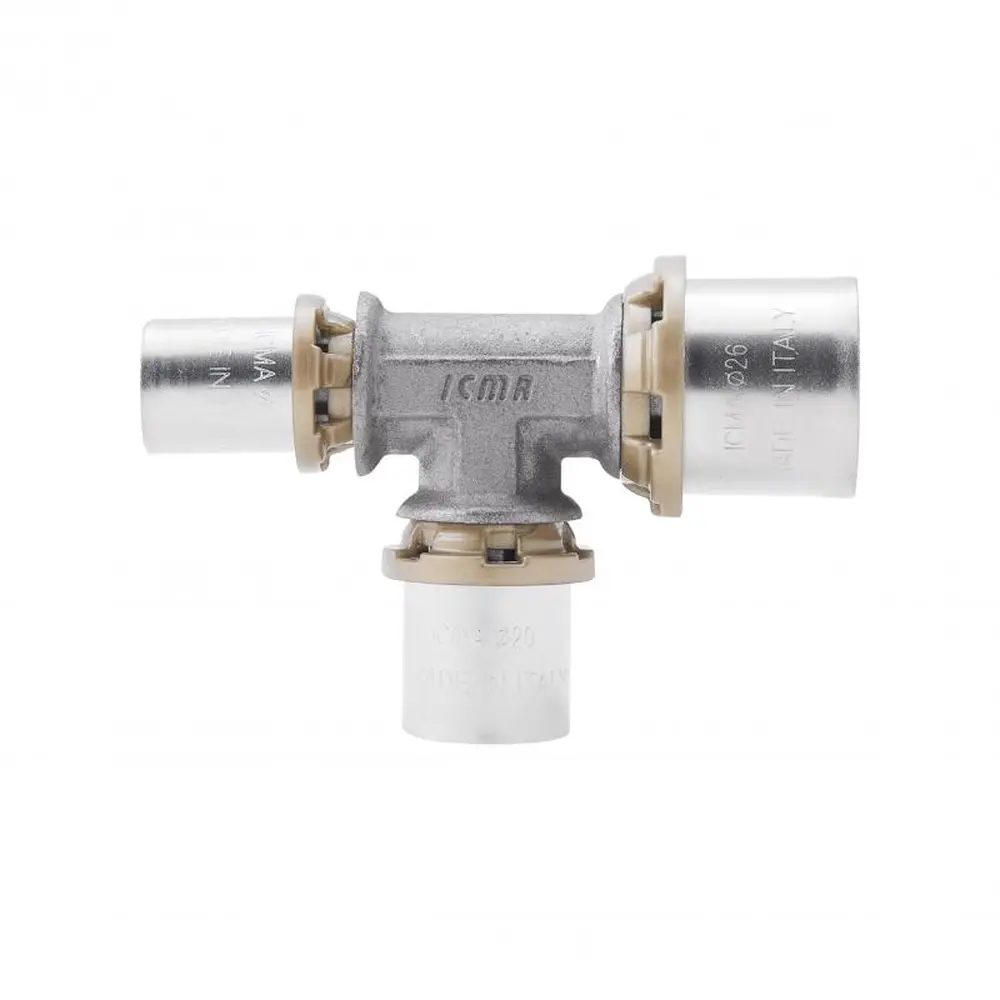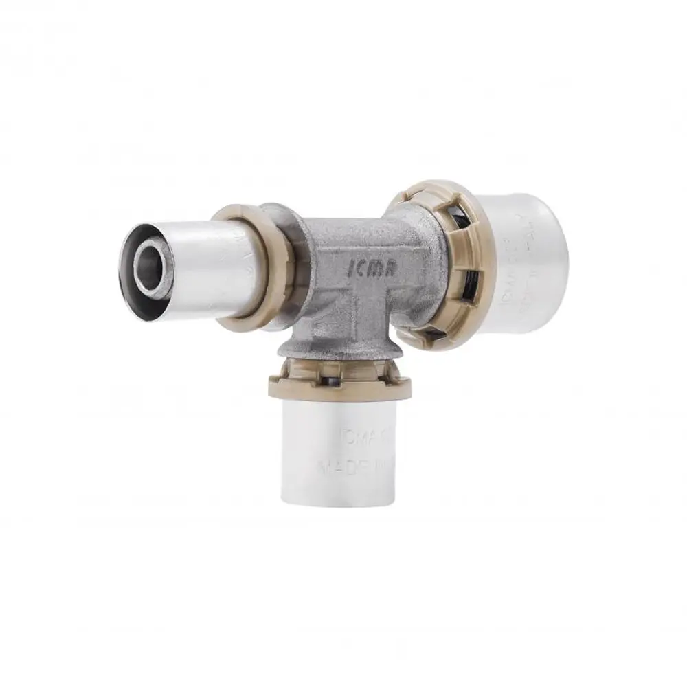 Прес-фітинг трійник Sempiter призначений для металопластикової труби для монтажу з радіальним пресуванням. Застосовується в системах водопостачання, опалення, і охолодження. Окремий прес на кожен діаметр труби стискає гільзу з нержавіючої сталі, яка надійно фіксує трубу на фітингу. Механічне з‘єднання забезпечує спеціальний профіль фітинга і гільзи з нержавіючої сталі, які були розроблені спеціально для того, щоб пресування відбувалося трьома різними профілями.