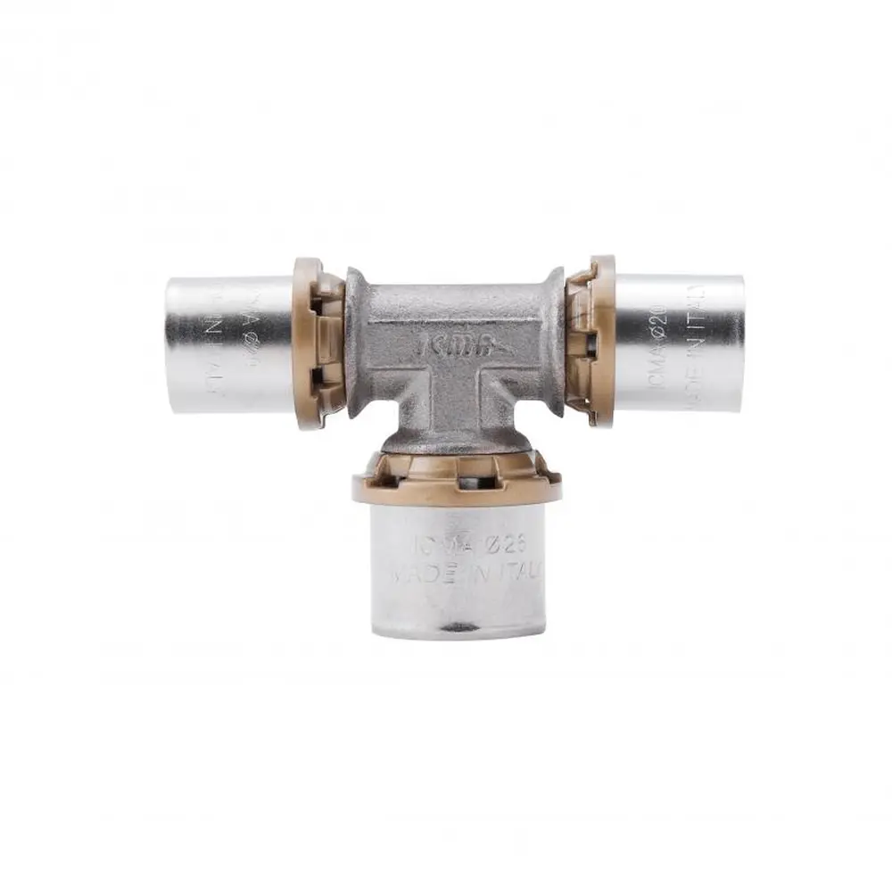Прес-фітинг трійник Sempiter призначений для металопластикової труби для монтажу з радіальним пресуванням. Застосовується в системах водопостачання, опалення, і охолодження. Окремий прес на кожен діаметр труби стискає гільзу з нержавіючої сталі, яка надійно фіксує трубу на фітингу. Механічне з‘єднання забезпечує спеціальний профіль фітинга і гільзи з нержавіючої сталі, які були розроблені спеціально для того, щоб пресування відбувалося трьома різними профілями.