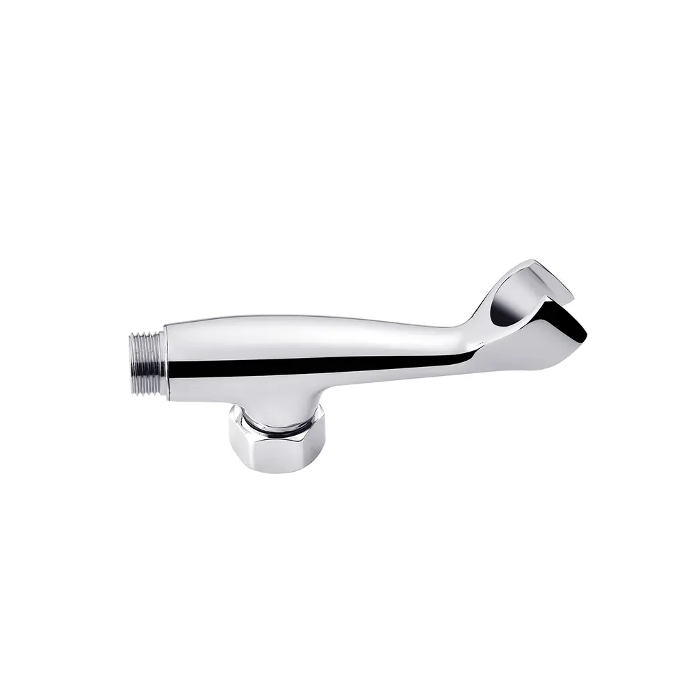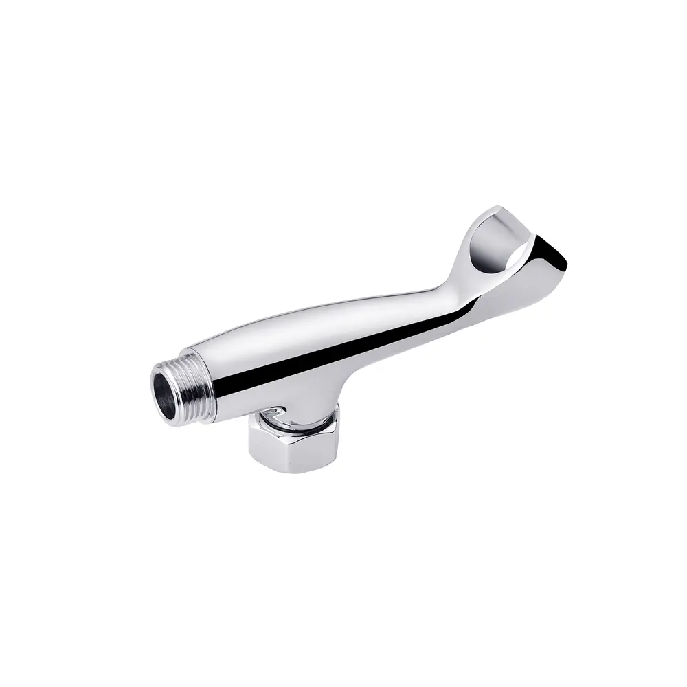 Кронштейн для ручного душа Kroner KRM-C919 хромированный, благодаря чему изделие устойчиво к царапинам, воздействию агрессивных моющих средств, образованию коррозии и износу. Он крепится к смесителю, состоит из продолговатого корпуса, подвода с внешней резьбой и универсальным диаметром 1/2" для подключения шланга, а также, держателя для лейки.