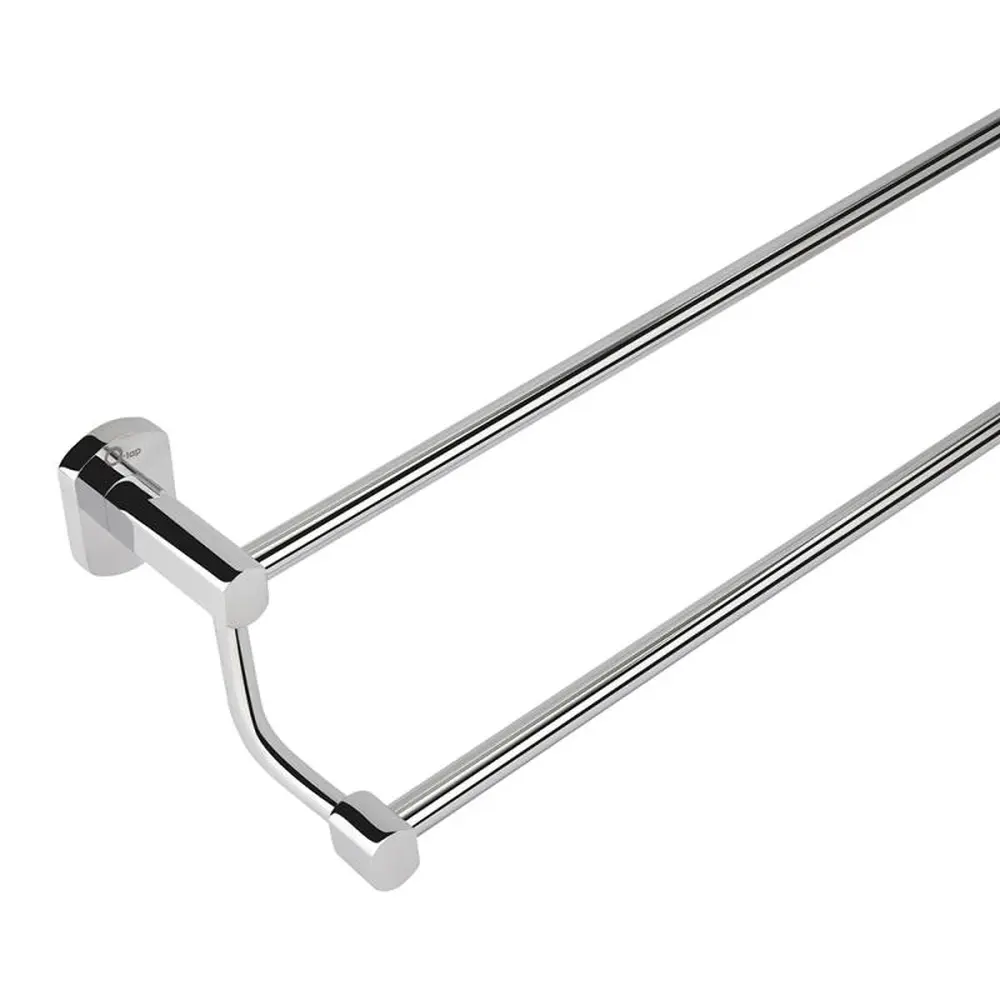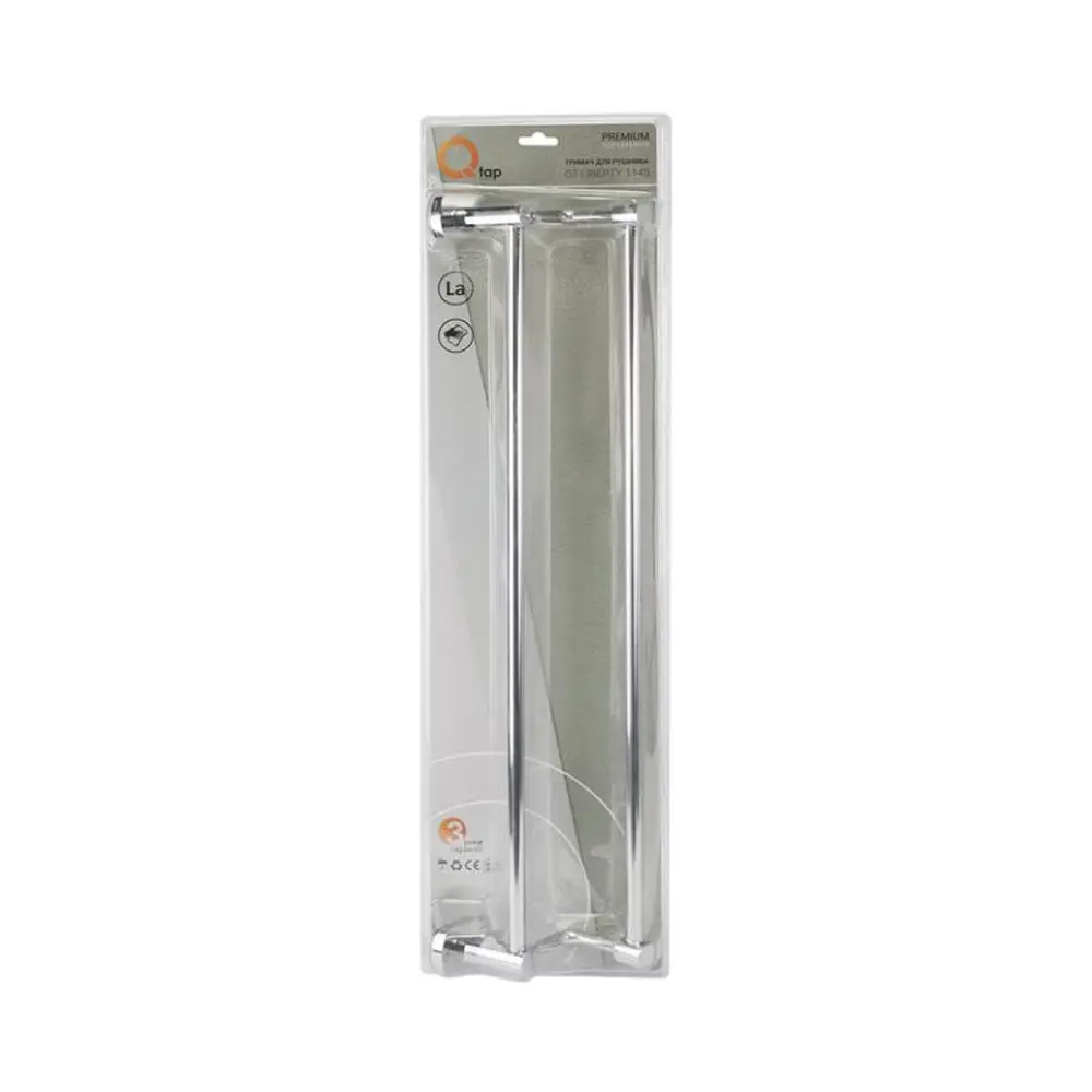 Тримач для рушників Qtap Liberty CRM 1148 виконаний з латуні з хромованою глянсовою поверхнею, яка легко миється та не піддається корозії. Тримач складається з кріплення і двох стрижнів, з‘єднаних вигнутими деталями, довжиною 610 мм кожен, які дозволяють розмістити відразу чотири рушники або два банних. Прихований монтаж не порушує дизайн ванної кімнати й не псує обробку. На тримач нанесено фірмовий логотип виробника.