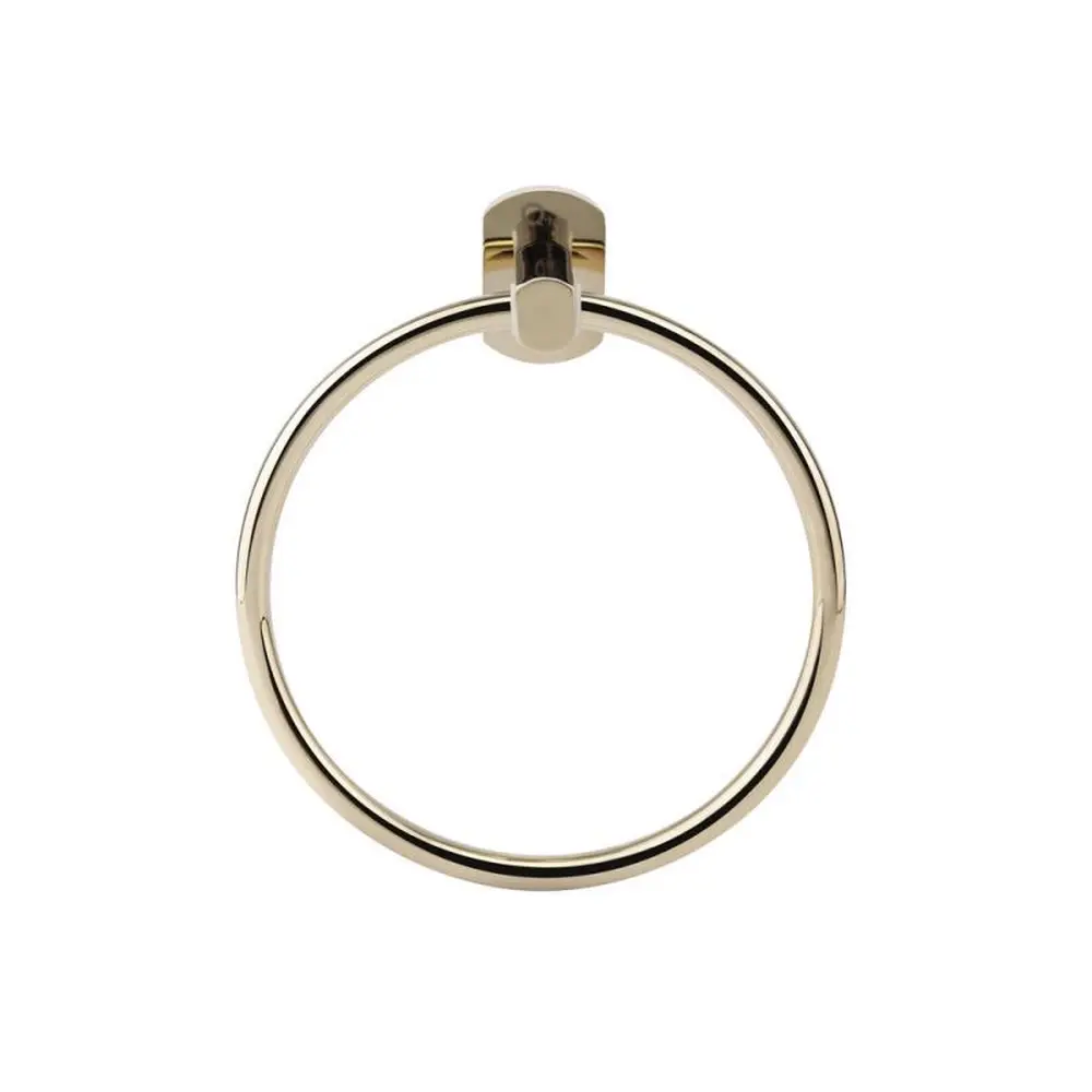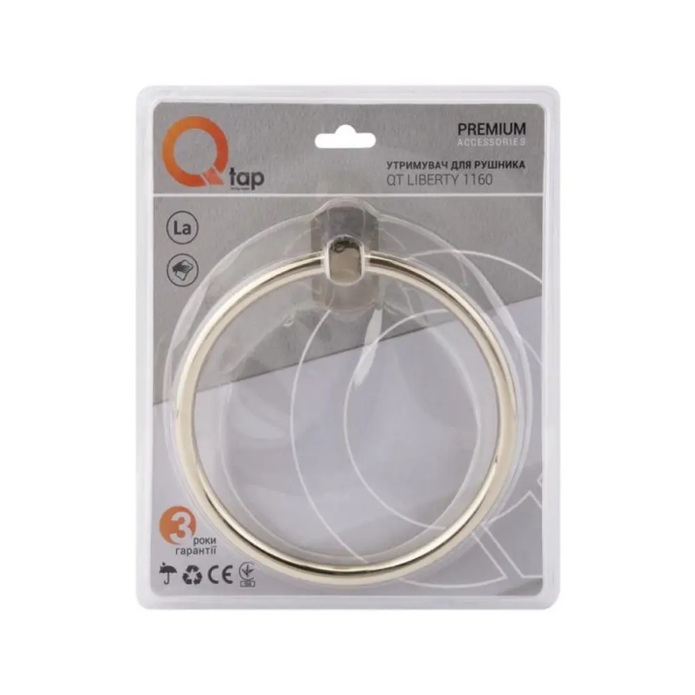 Тримач для рушників Qtap Liberty ORO 1160 у формі кільця виконаний з латуні з золотою глянцевою поверхнею, яка легко миється і не піддається корозії. Прихований монтаж не порушує дизайну ванної кімнати та не псує обробку. На тримач нанесено фірмовий логотип виробника.