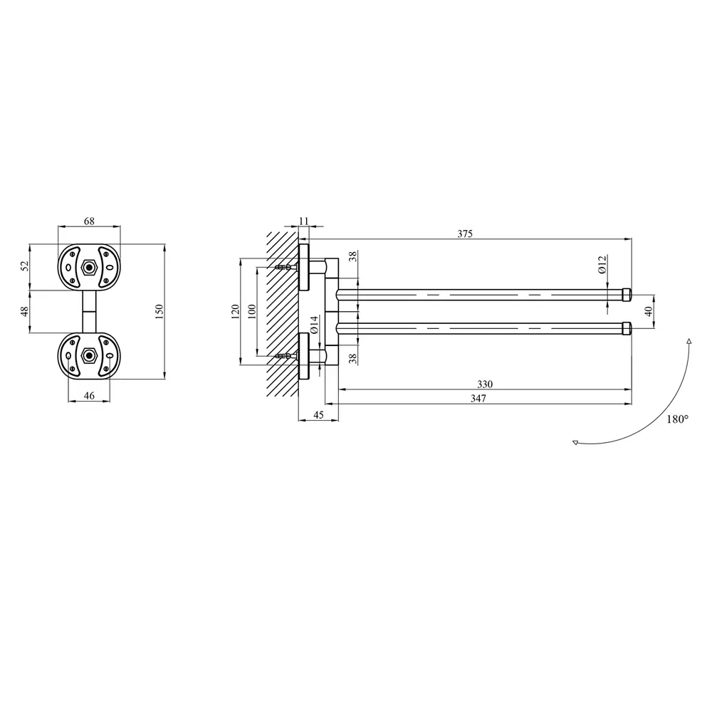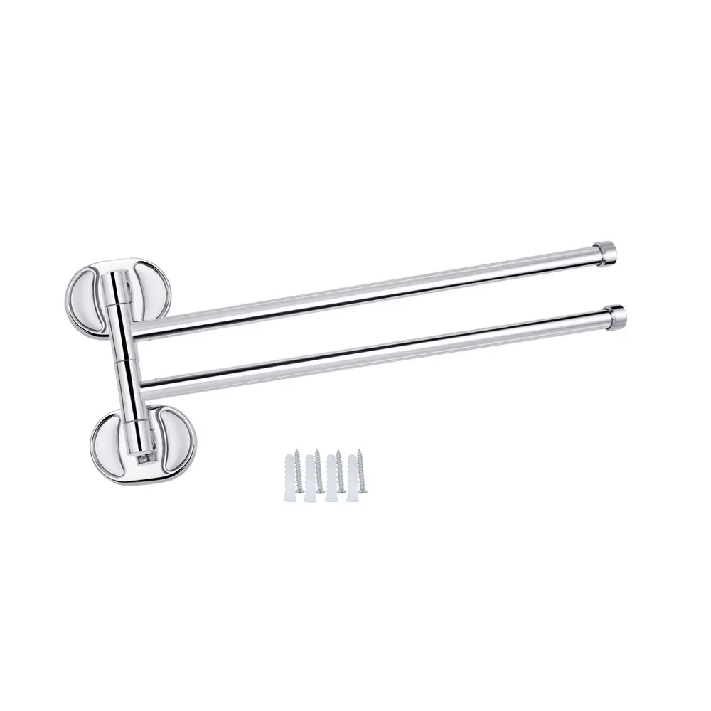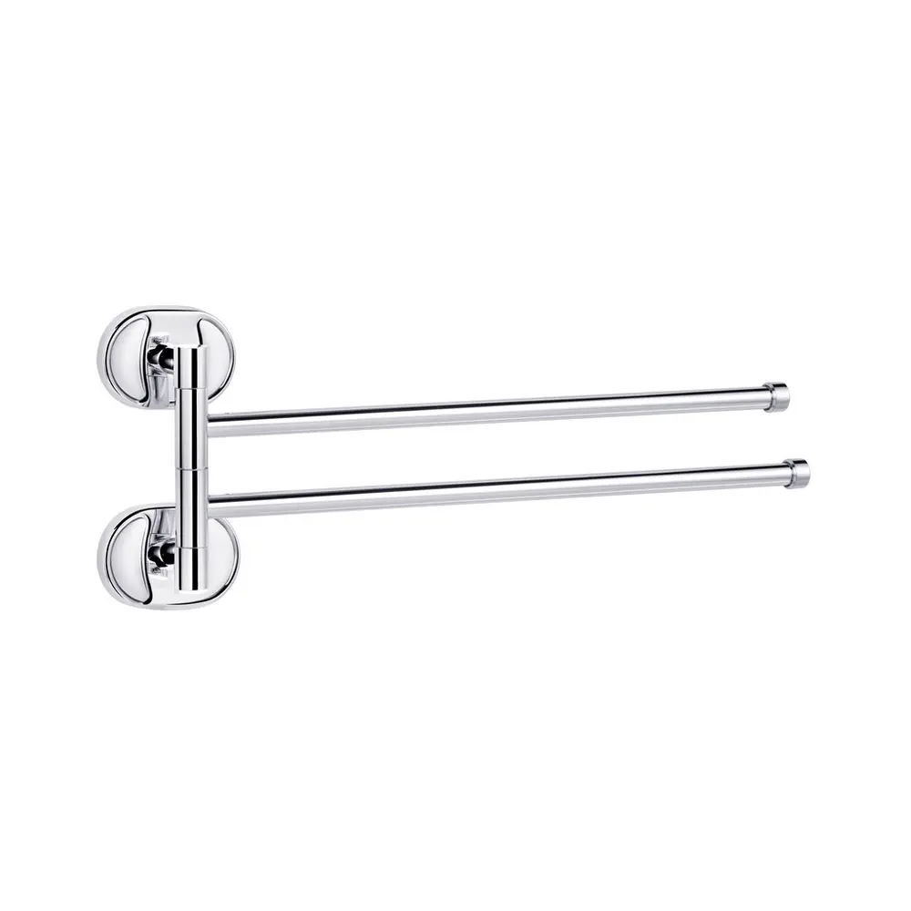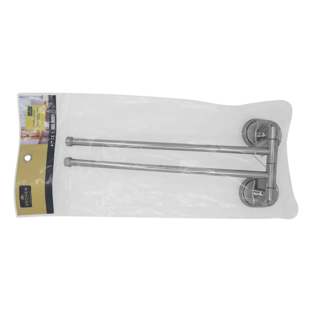 Подвійний тримач для рушників Kroner KRM Elbe-ACC2912 стане оригінальним доповненням ванної кімнати. Тримач для рушників виготовлений із міцного металу з хромованою поверхнею й має два поворотних стрижні, на які можна розмістити два рушники. Довжина виробу 375 мм. Приховане кріплення дає змогу зберегти оздобу, а хромоване покриття запобіжить утворенню корозії та бруду. Тримач для рушників кріпиться на стіні на бажаній висоті.