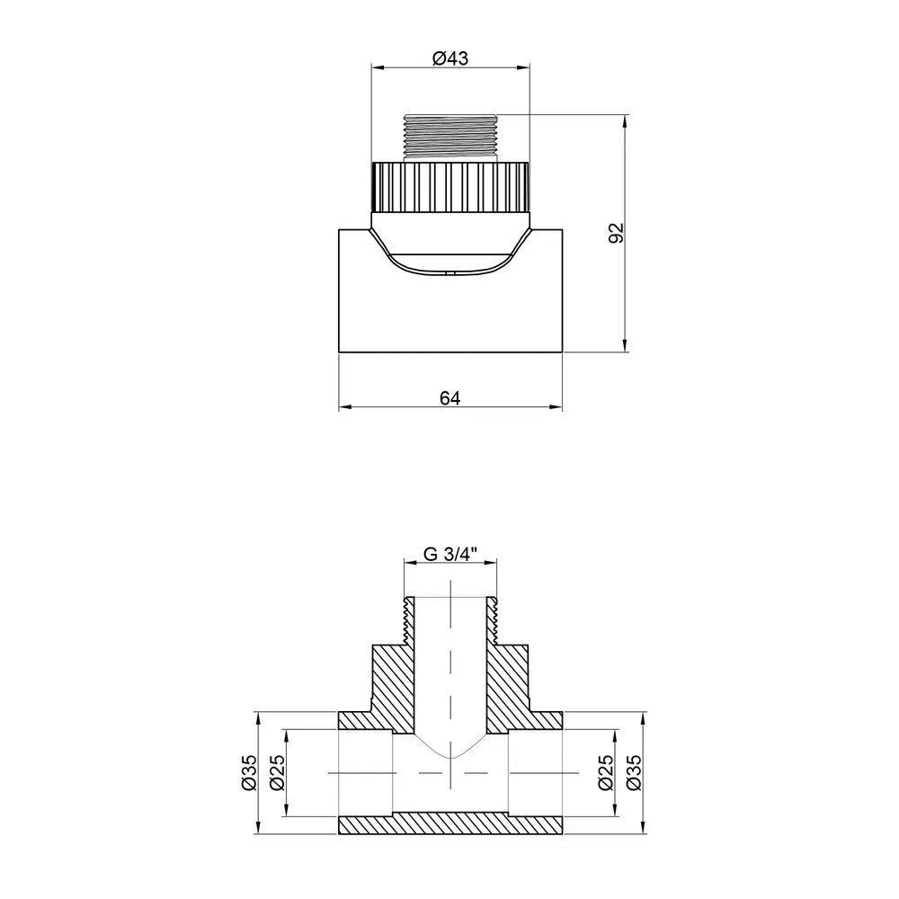 Трійник PPR Thermo Alliance 25х3/4"х25 ЗР — Т-подібний фітінг, дві сторони якого під‘єднують до трубопроводу за допомогою поліфузної пайки (діаметр 25 мм), кінець третьої деталі забезпечений латунною вставкою із зовнішньою різьбою 3/4" для виконання різьбових з‘єднань. Сфера застосування виробу — монтаж систем гарячого й холодного водопостачання та опалення. Виріб дозволяє виконати розгалуження трубопровідної магістралі. Допустима температура робочого середовища до 90 °С.