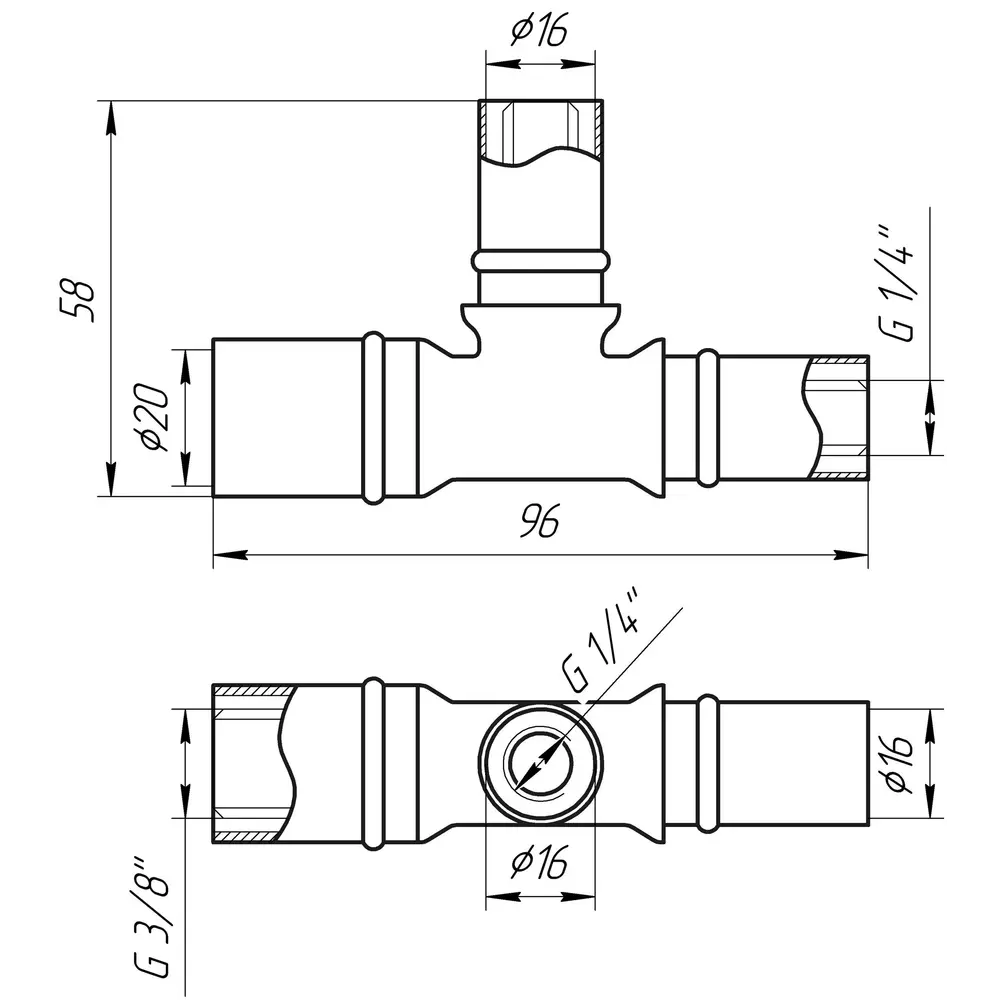 Габарити: 20 * 16 * 16 на 16 і 20 металопластикових труб