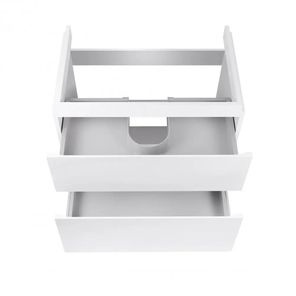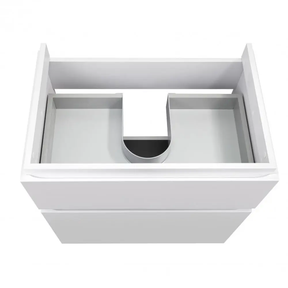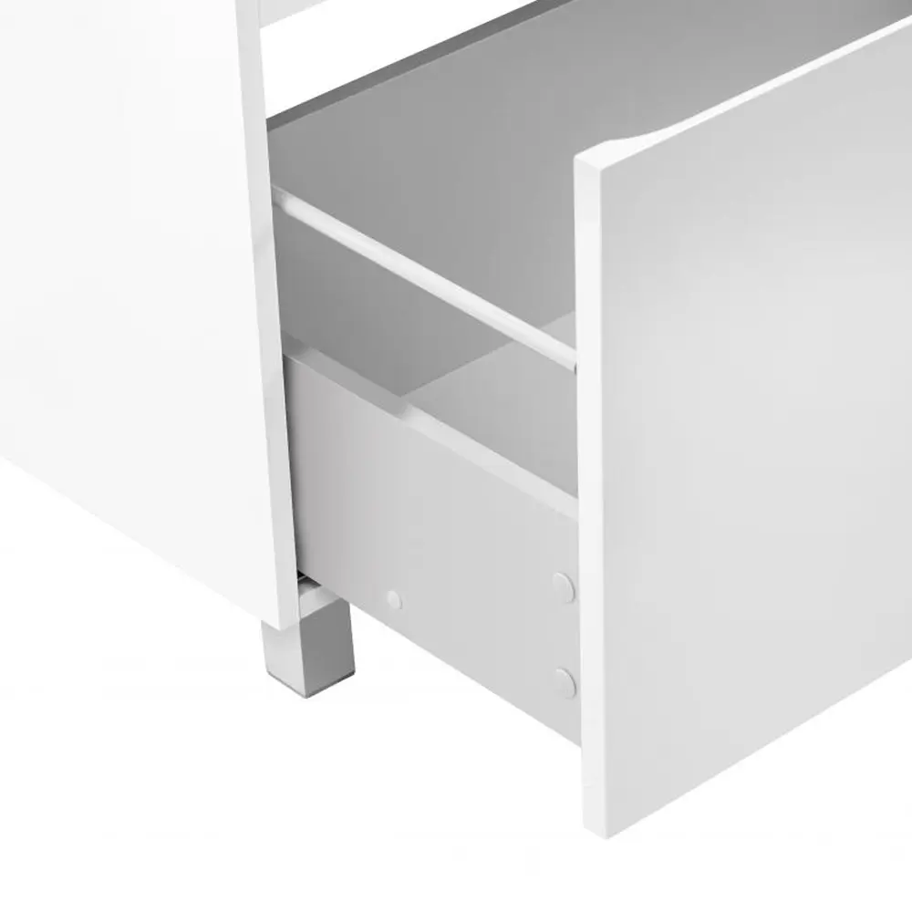 Підлогова тумба Qtap Albatross QT0173TN800DW виконана з отвором під сифон. У комплекті чотири хромовані ніжки з пластика з металевим каркасом. Корпус тумби виготовлено з ДСП, з двошаровою ламінацією білого кольору, фасадна частина з МДФ з глянцевим покриттям. Тумба оснащена двома висувними ящиками з механізмом доводчика. Виріб виконано в елегантному лаконічному стилі, який доповнить раковину і підійде до дизайну будь-якої ванної кімнати.