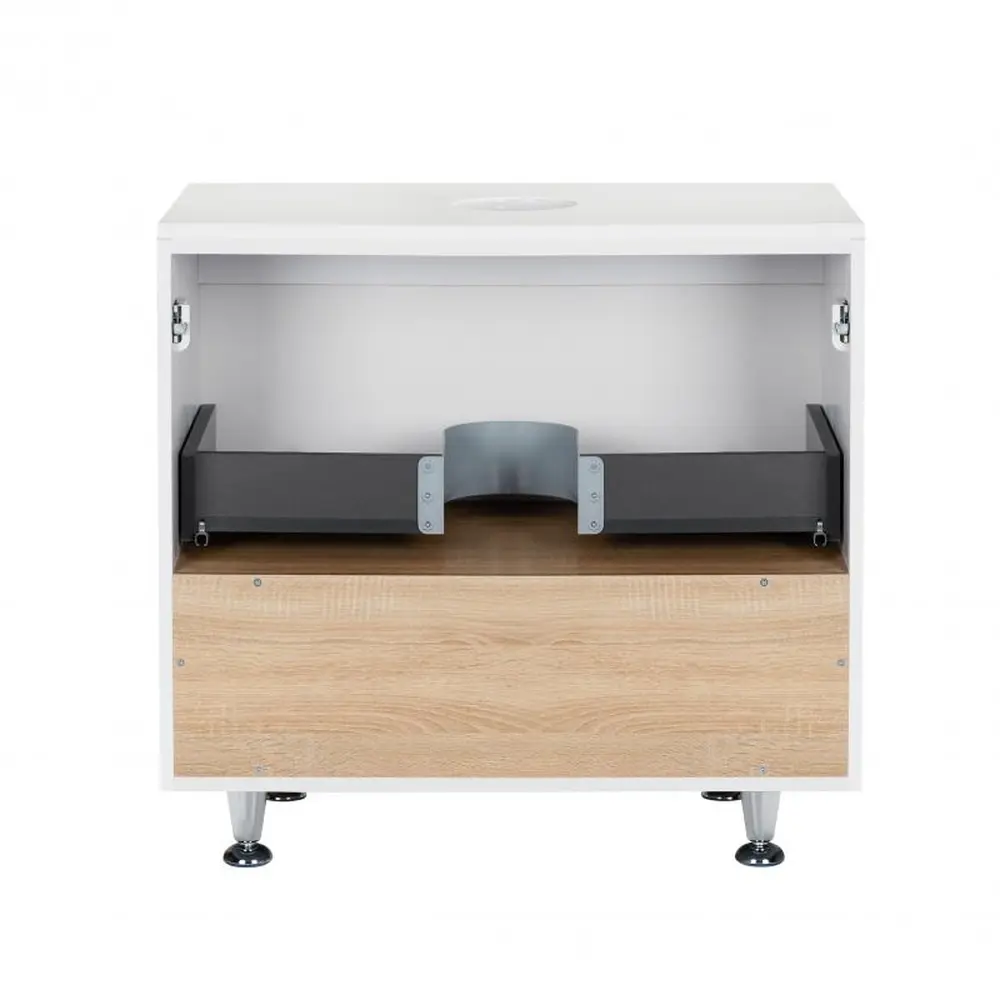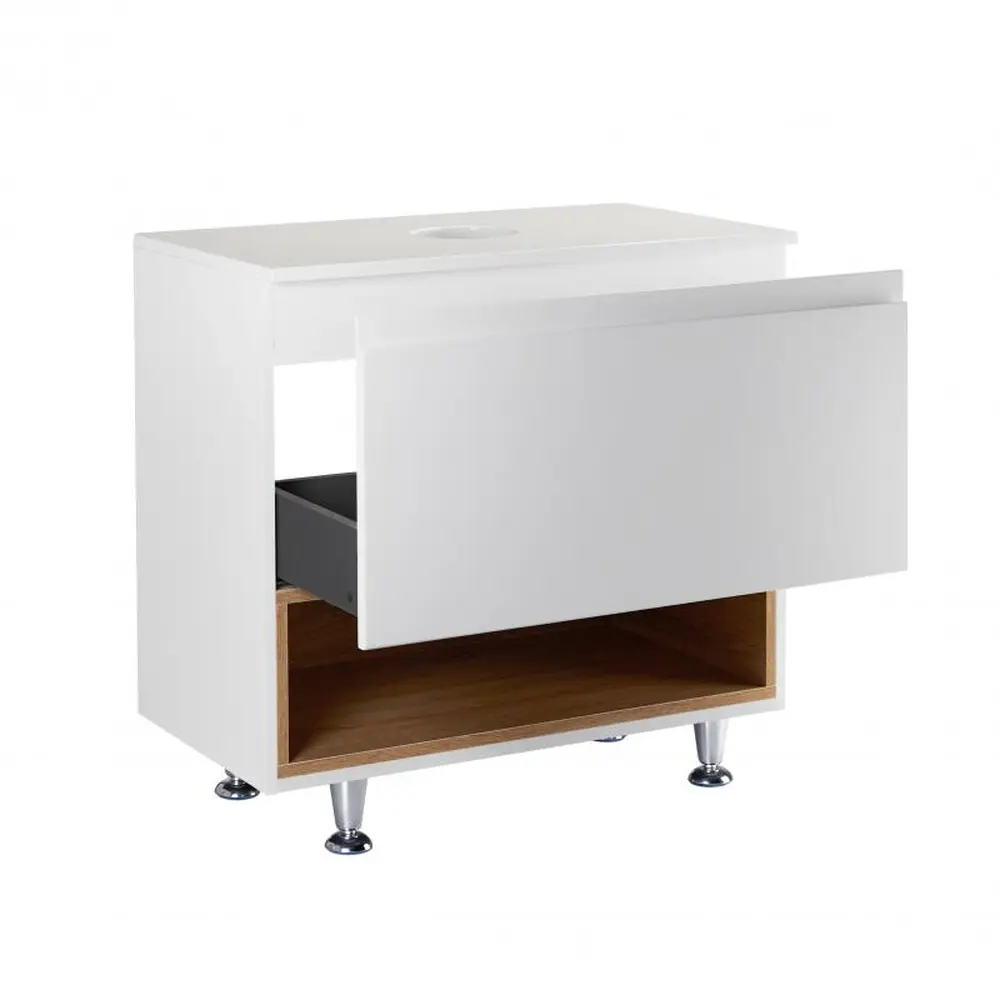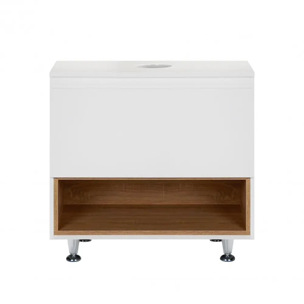 Підлогова тумба Qtap Robin QT1380TNН7001WWO виконана з отвором для встановлення накладної раковини, а також отвором під сифон. Корпус тумби сірого кольору виготовлений з ЛДСП, фасадна частина - з МДФ з глянцевим покриттям. Виріб оснащений зручним і містким висувним ящиком з механізмом доведення, а також стильною полицею кольору білого дуба. Тумба виконана в елегантному лаконічному стилі і пасуватиме до дизайну будь-якої сучасної ванної кімнати.