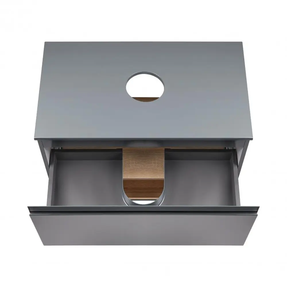 Підлогова тумба Qtap Robin QT1380TNН8002GWO виконана з отвором для встановлення накладної раковини, а також отвором під сифон. Корпус тумби сірого кольору виготовлений з ЛДСП, фасадна частина - з МДФ з глянцевим покриттям. Виріб оснащений зручним і містким висувним ящиком з механізмом доведення, а також стильною полицею кольору білого дуба. Тумба виконана в елегантному лаконічному стилі і пасуватиме до дизайну будь-якої сучасної ванної кімнати.