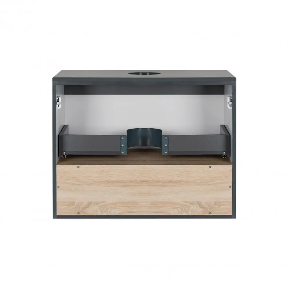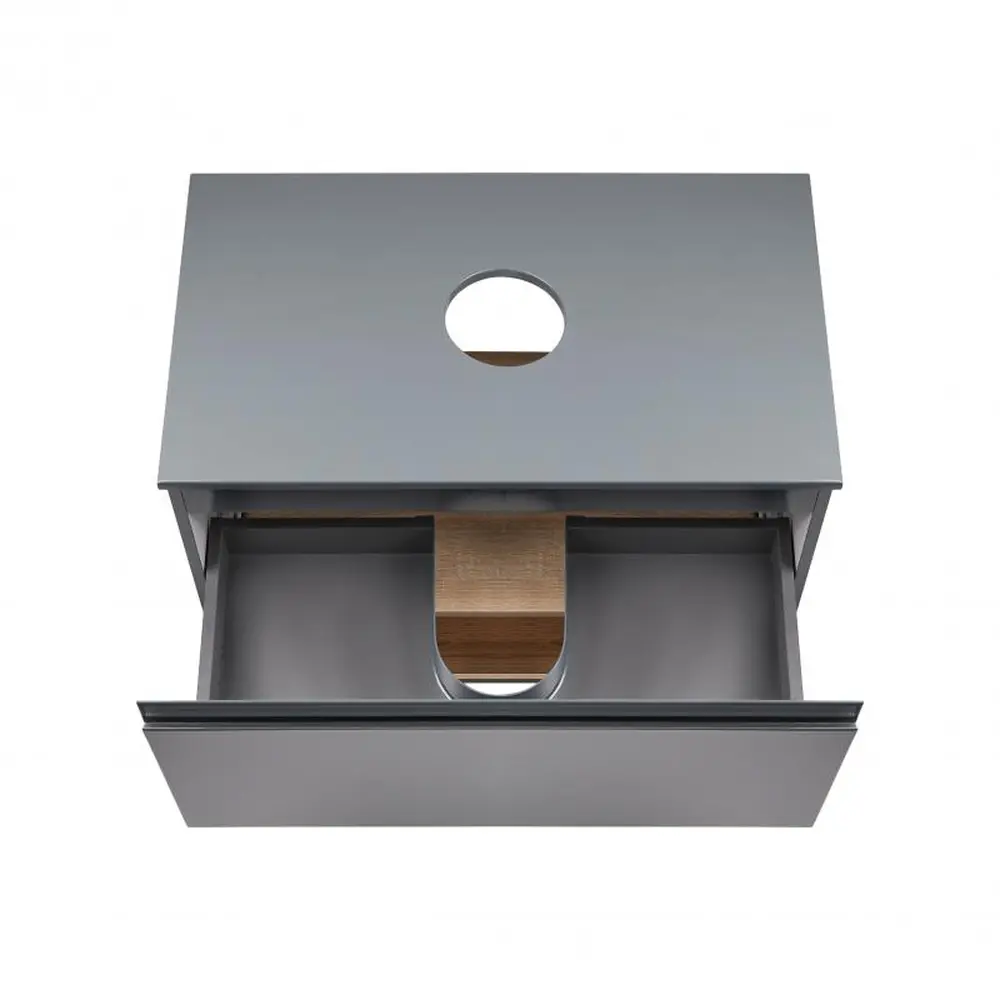 Підвісна тумба Qtap Robin QT1379TPН6002GWO виконана з отвором для встановлення накладної раковини, а також отвором під сифон. Корпус тумби сірого кольору виготовлений з ЛДСП, фасадна частина - з МДФ з глянцевим покриттям. Виріб оснащений зручним і містким висувним ящиком з механізмом доводчика, а також стильною полицею кольору білого дуба. Тумба виконана в елегантному лаконічному стилі. Завдяки підвісній конструкції прибирання не додасть зайвого клопоту.