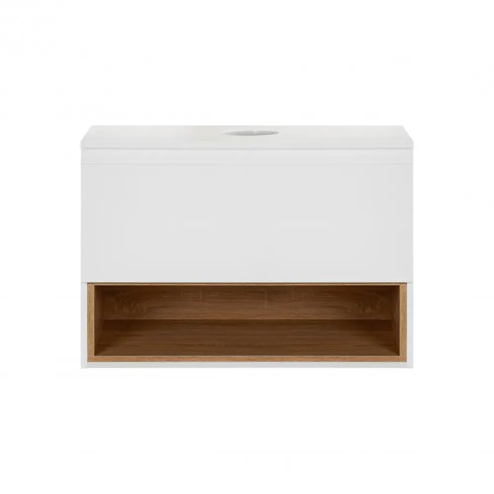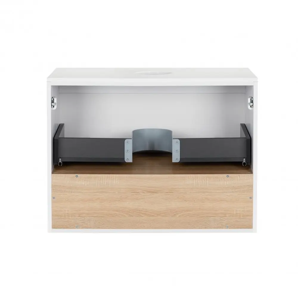 Підвісна тумба Qtap Robin QT1379TPН7001WWO виконана з отвором для встановлення накладної раковини, а також отвором під сифон. Корпус тумби білого кольору виготовлений з ЛДСП, фасадна частина - з МДФ з глянцевим покриттям. Виріб оснащений зручним і містким висувним ящиком з механізмом доводчика, а також стильною полицею кольору білого дуба. Тумба виконана в елегантному лаконічному стилі. Завдяки підвісній конструкції прибирання не додасть зайвого клопоту.