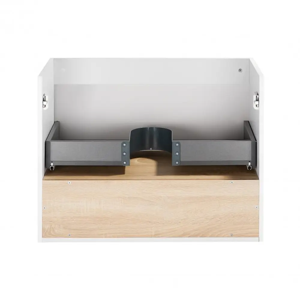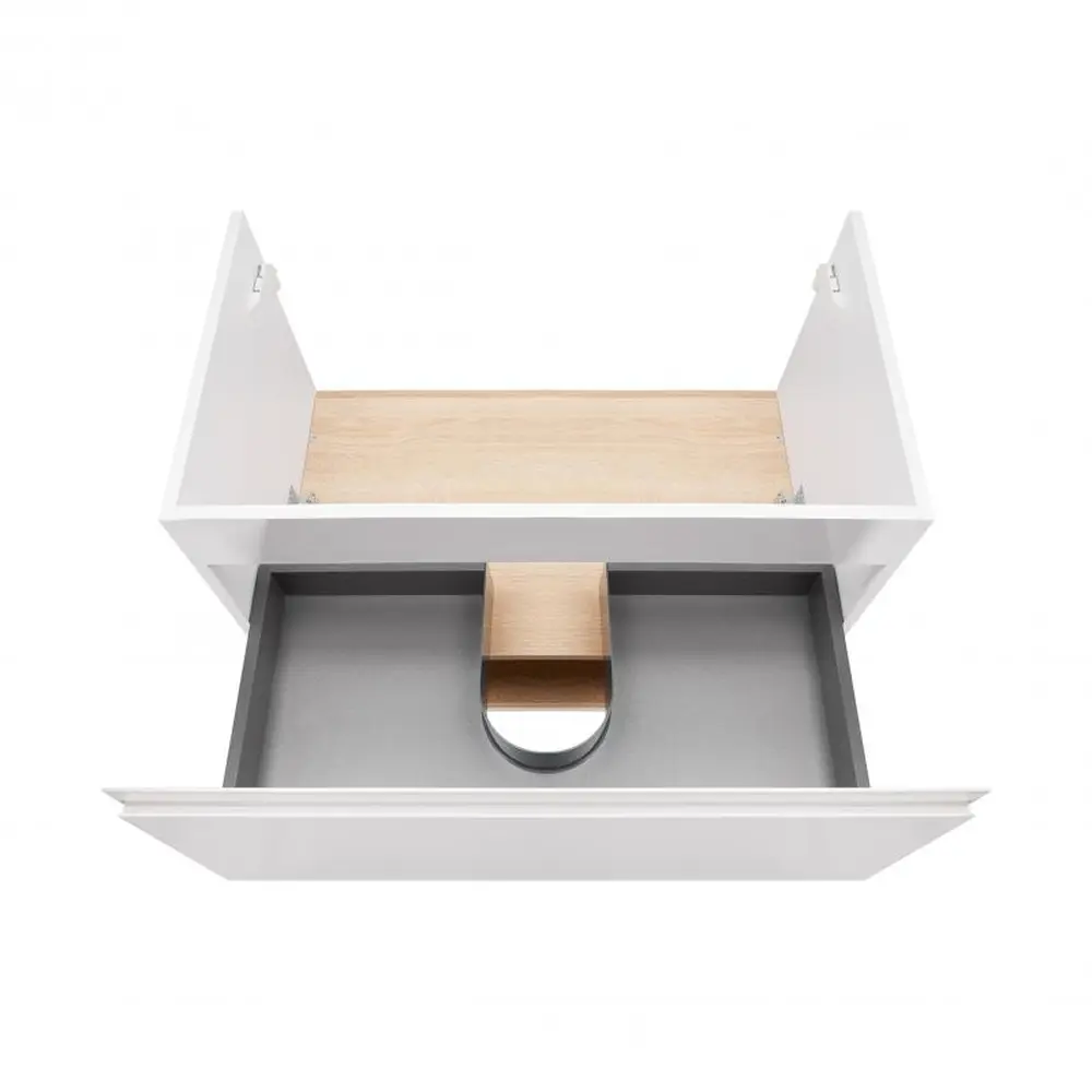 Підвісна тумба Qtap Robin QT1374TPВ7001WWO виконана з отвором під сифон. Корпус тумби білого кольору виготовлений з ЛДСП, фасадна частина - з МДФ з глянцевим покриттям. Виріб оснащений зручним і містким висувним ящиком з механізмом доводчика, а також стильною полицею кольору білого дуба. Тумба виконана в елегантному лаконічному стилі і впишеться в дизайн будь-якої ванної кімнати. Завдяки підвісній конструкції прибирання приміщення не завдасть зайвого клопоту.