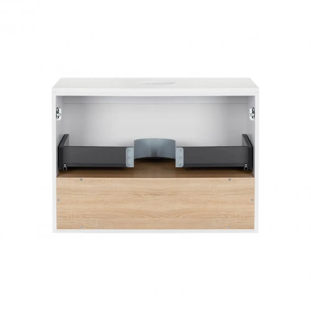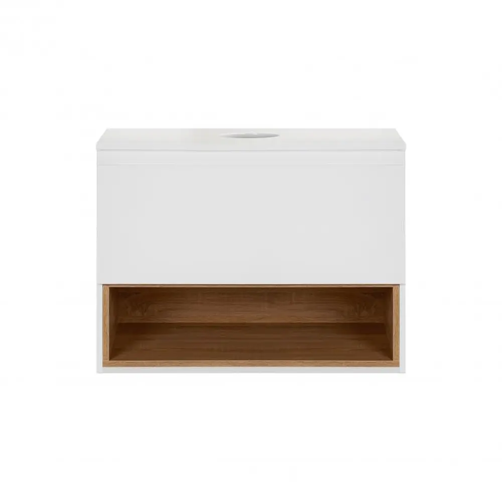 Підвісна тумба Qtap Robin QT1379TPН6001WWO виконана з отвором для встановлення накладної раковини, а також отвором під сифон. Корпус тумби білого кольору виготовлений з ЛДСП, фасадна частина - з МДФ з глянцевим покриттям. Виріб оснащений зручним і містким висувним ящиком з механізмом доводчика, а також стильною полицею кольору білого дуба. Тумба виконана в елегантному лаконічному стилі. Завдяки підвісній конструкції прибирання не додасть зайвого клопоту.
