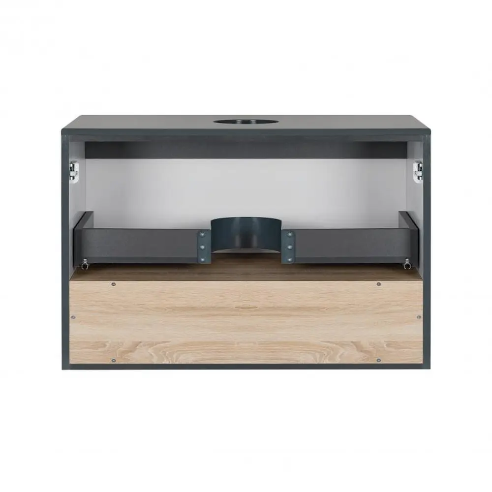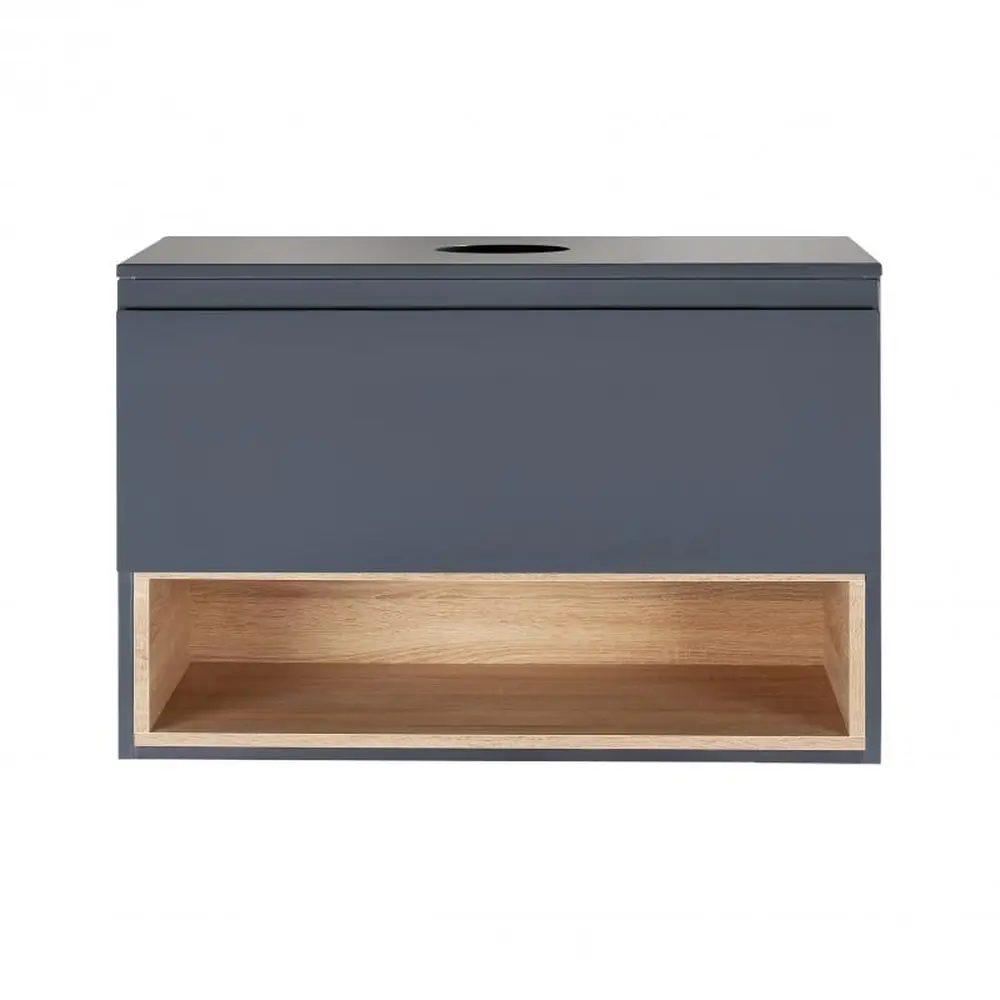 Підвісна тумба Qtap Robin QT1379TPН8002GWO виконана з отвором для встановлення накладної раковини, а також отвором під сифон. Корпус тумби сірого кольору виготовлений з ЛДСП, фасадна частина - з МДФ з глянцевим покриттям. Виріб оснащений зручним і містким висувним ящиком з механізмом доводчика, а також стильною полицею кольору білого дуба. Тумба виконана в елегантному лаконічному стилі. Завдяки підвісній конструкції прибирання не додасть зайвого клопоту.