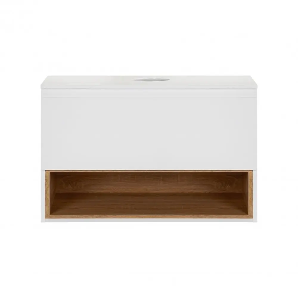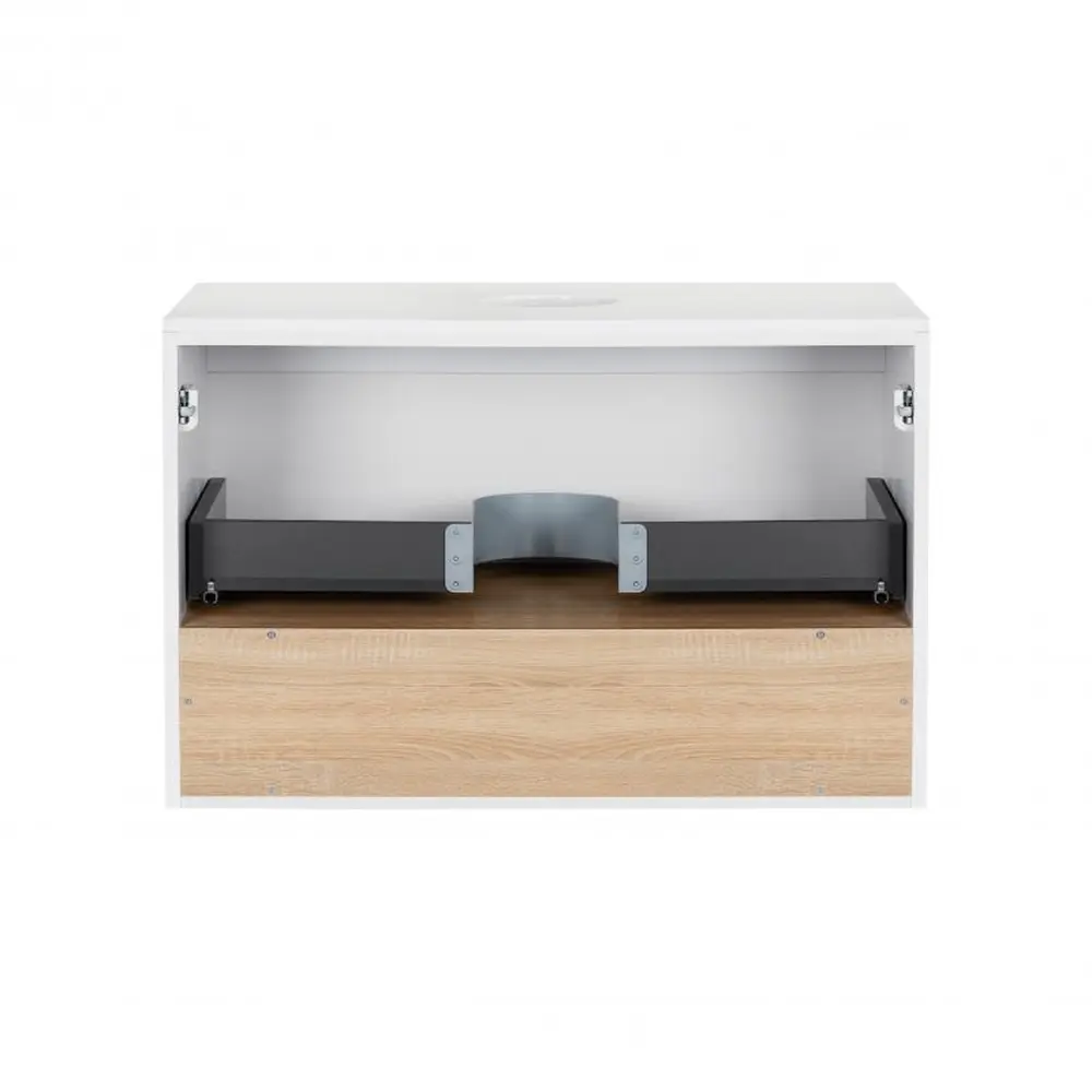 Підвісна тумба Qtap Robin QT1379TPН8001WWO виконана з отвором для встановлення накладної раковини, а також отвором під сифон. Корпус тумби білого кольору виготовлений з ЛДСП, фасадна частина - з МДФ з глянцевим покриттям. Виріб оснащений зручним і містким висувним ящиком з механізмом доводчика, а також стильною полицею кольору білого дуба. Тумба виконана в елегантному лаконічному стилі. Завдяки підвісній конструкції прибирання не додасть зайвого клопоту.