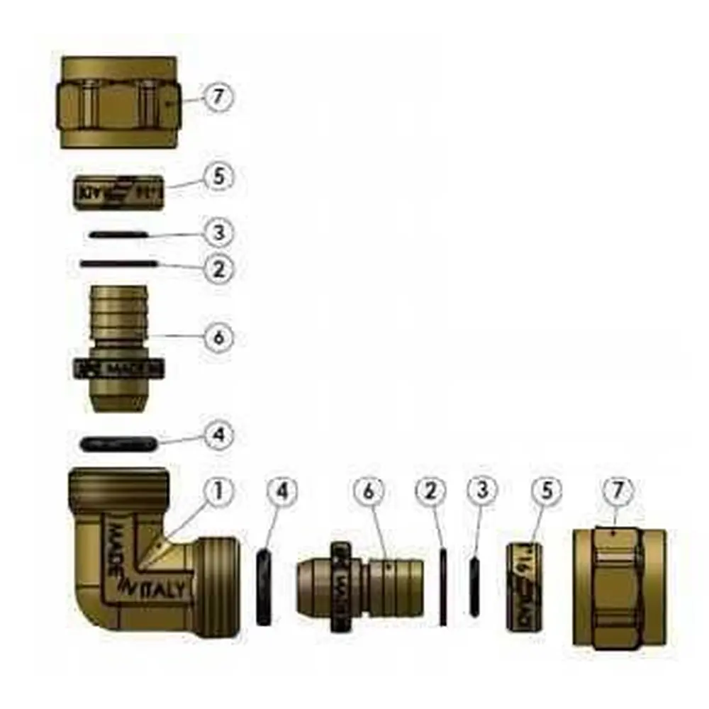 Кути проміжні серії 751 L були спроектовані і реалізовані для надання допомоги установника, скорочуючи час на монтаж і збільшуючи характеристики стійкості в часі. Крім того, дана серія фітингів не вимагає особливих інструментів для монтажу Стійкість кріплення між трубою і фитингом гарантується одночасним наявністю двох кілець ущільнювачів (2), розташованих в ялинці (6) і особливою, противоскользящей, формою самої ялинки (у вигляді зубів пилки). Кріплення труби відбувається за рахунок особливого виду пресування, що складається з радіального пресування, отриманого за рахунок загвинчування гайки (7) яка визначає стиснення розрізаної ожівальной частини (5) навколо труби і осьового пресування, яке стискає кільце ущільнювача (4) на корпусі. Подібна система пресування гарантує стійкість отриманого зєднання в будь-яких умовах роботи. Крім того, працюючи на латуні в пресуванні, виключаються ризики виникнення мікротріщин. Наявність шайби (3) з PTFE ізолює алюміній труби від латуні фитинга для уникнення виникнення корозійних ефектів