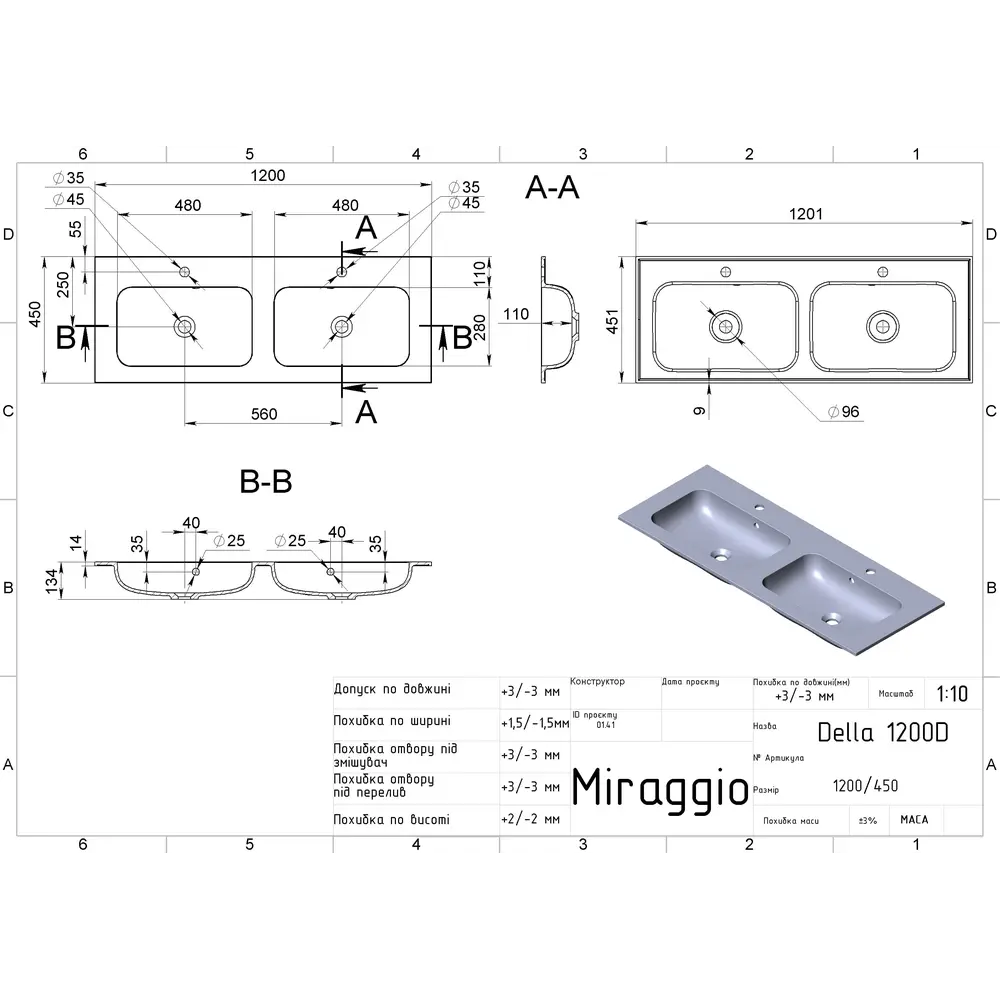 Умивальник DELLA 1200-2 MATT MIRAGGIO зі штучного каменю - це практичне рішення для санвузла дому, готелю чи дачі.