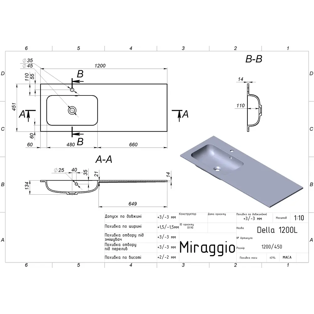 Умивальник DELLA 1200 L MIRAGGIO зі штучного каменю - це практичне рішення для санвузла дому, готелю чи дачі.