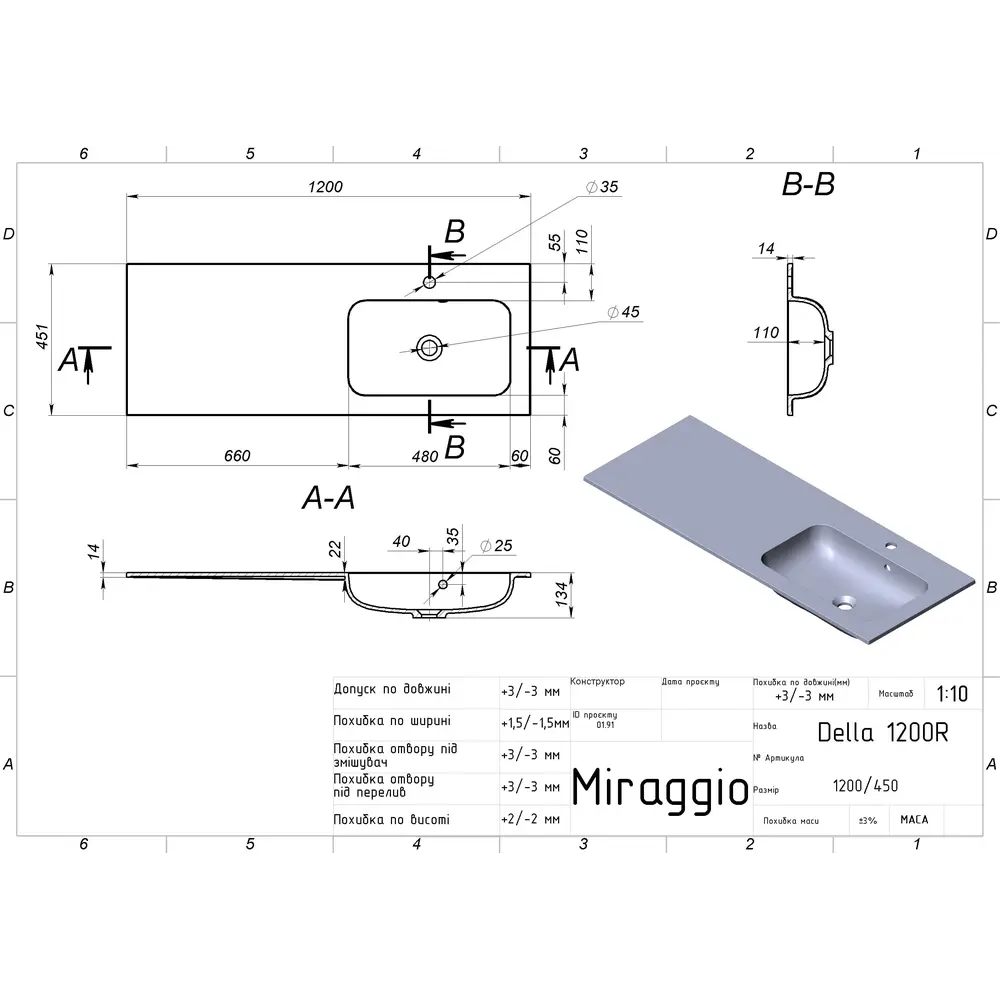 Умивальник DELLA 1200 R MIRAGGIO зі штучного каменю - це практичне рішення для санвузла дому, готелю чи дачі.