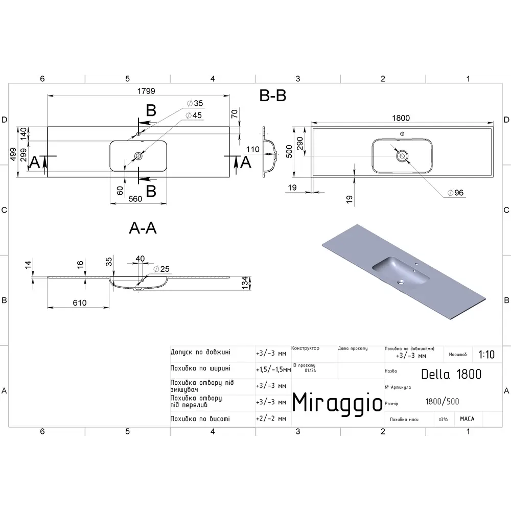 Умивальник DELLA 1800 MIRAGGIO зі штучного каменю - це практичне рішення для санвузла дому, готелю чи дачі.