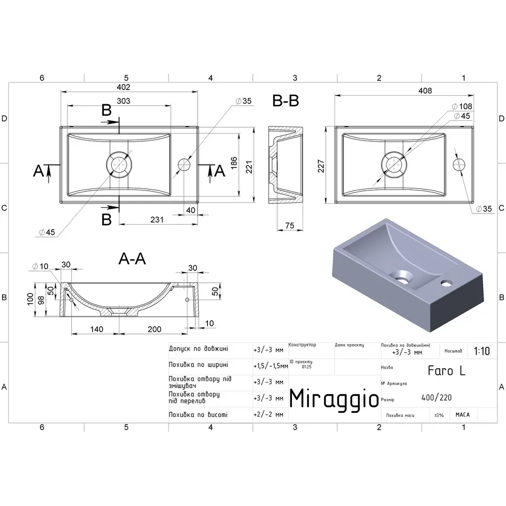 Умивальник FARO L MATT MIRAGGIO зі штучного каменю - це практичне рішення для санвузла дому, готелю чи дачі.