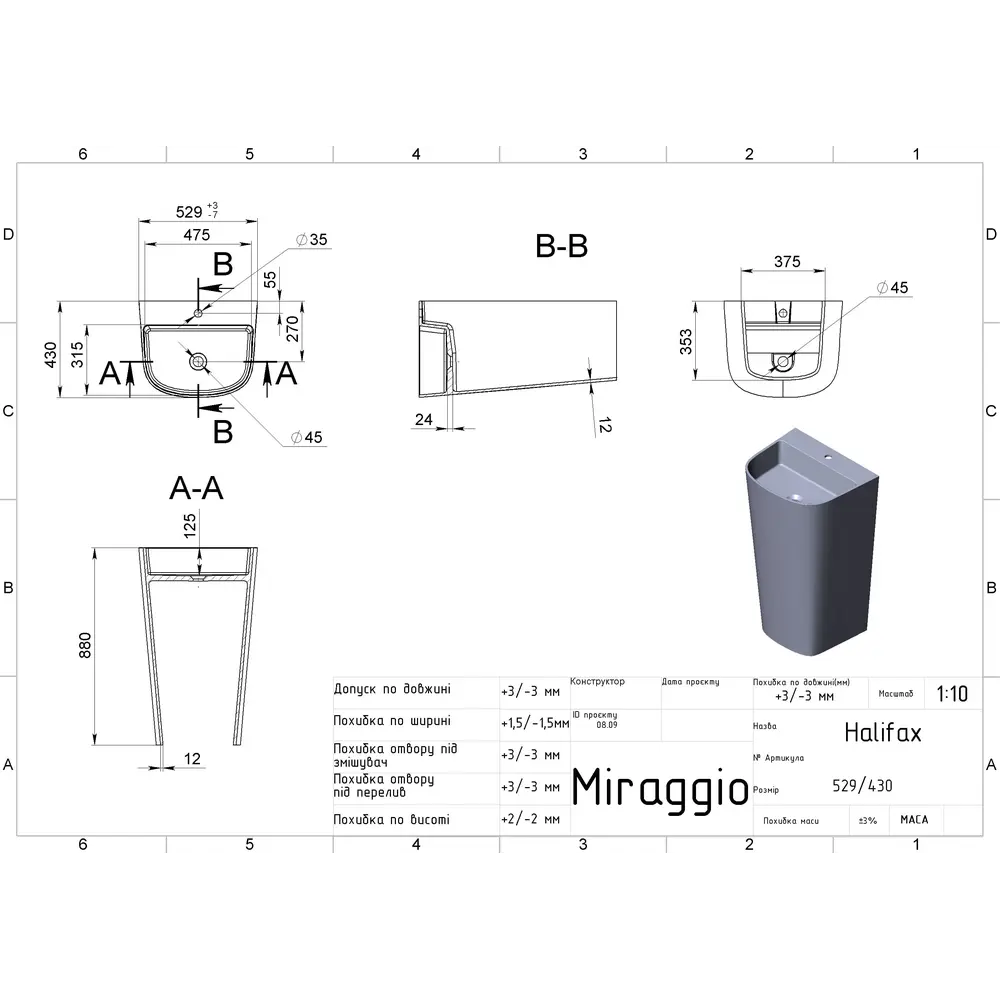 Умивальник HALIFAX MATT MIRAGGIO зі штучного каменю - це практичне рішення для санвузла дому, готелю чи дачі.