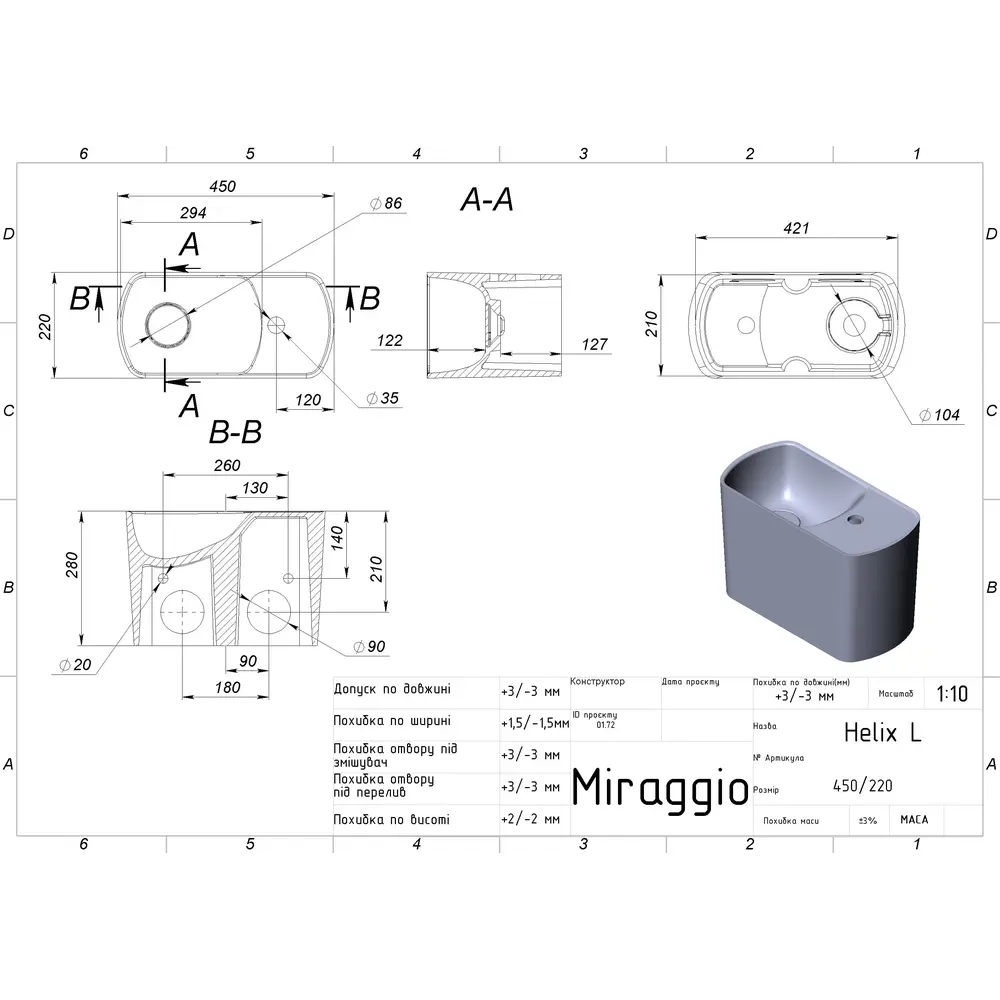 Умивальник HELIX L MATT MIRAGGIO зі штучного каменю - це практичне рішення для санвузла дому, готелю чи дачі.