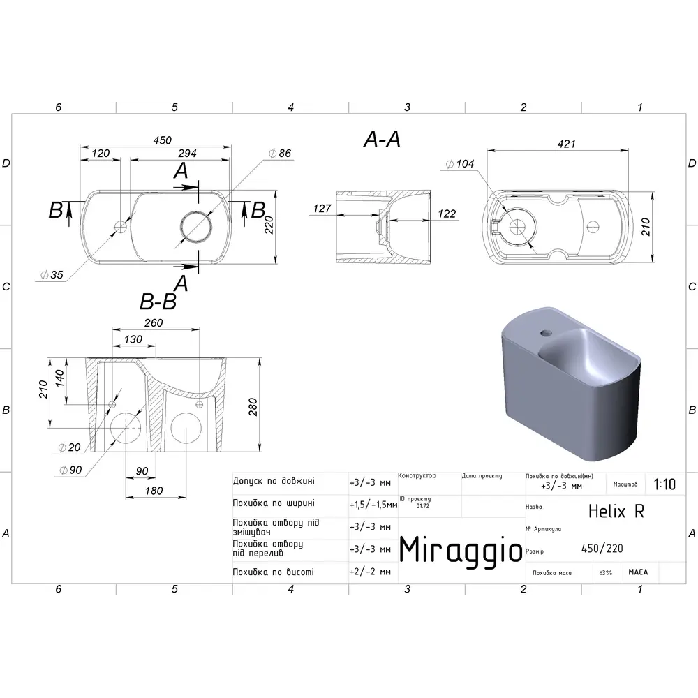 Умивальник HELIX R MIRASOFT MIRAGGIO зі штучного каменю - це практичне рішення для санвузла дому, готелю чи дачі.