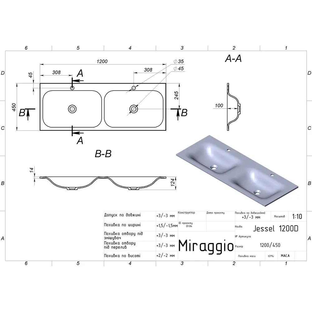 Умивальник JESSEL 1200-2 MIRAGGIO зі штучного каменю - це практичне рішення для санвузла дому, готелю чи дачі.