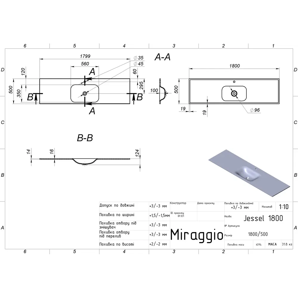 Умивальник JESSEL 1800 MIRAGGIO зі штучного каменю - це практичне рішення для санвузла дому, готелю чи дачі.