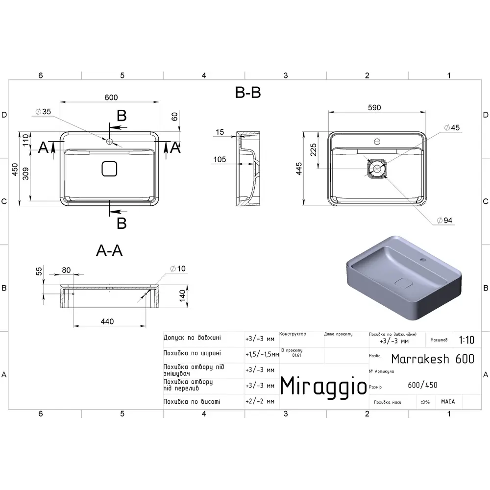 Умивальник MARRAKESH 600 MIRAGGIO зі штучного каменю - це практичне рішення для санвузла дому, готелю чи дачі.