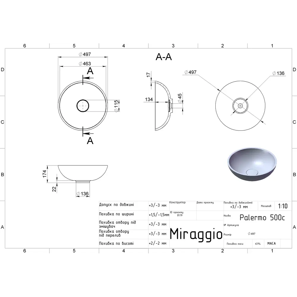 Умивальник PALERMO MIRAGGIO зі штучного каменю - це практичне рішення для санвузла дому, готелю чи дачі.
