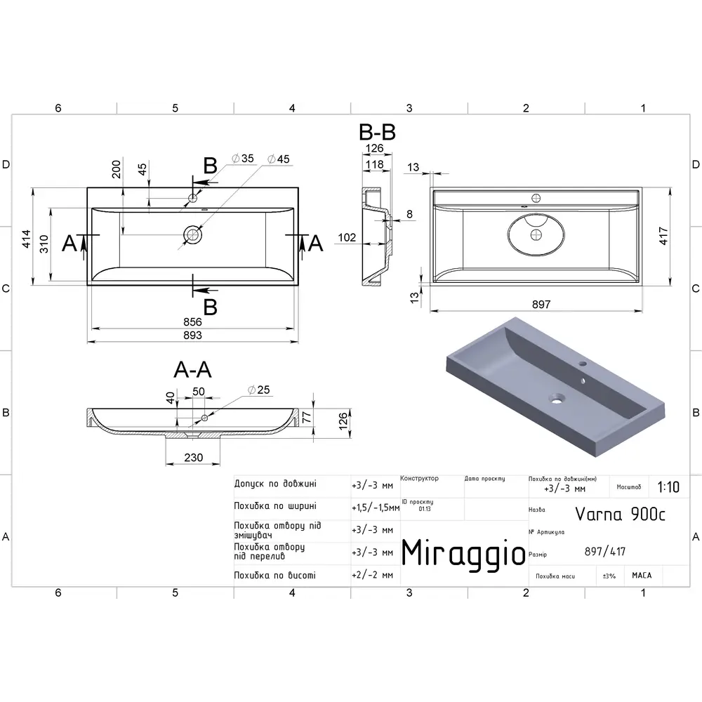 Умивальник VARNA 900 MIRASOFT MIRAGGIO зі штучного каменю - це практичне рішення для санвузла дому, готелю чи дачі.