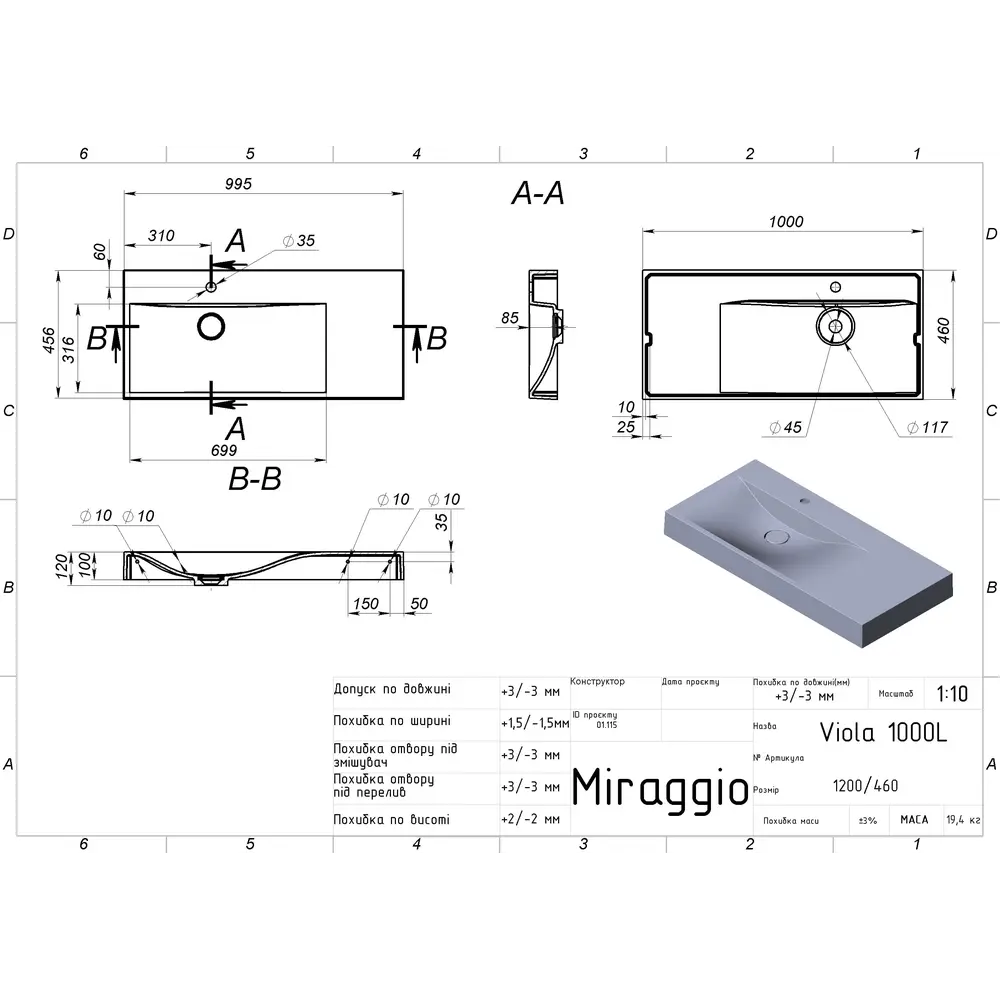 Умивальник VIOLA 1000 L MATT MIRAGGIO зі штучного каменю - це практичне рішення для санвузла дому, готелю чи дачі.
