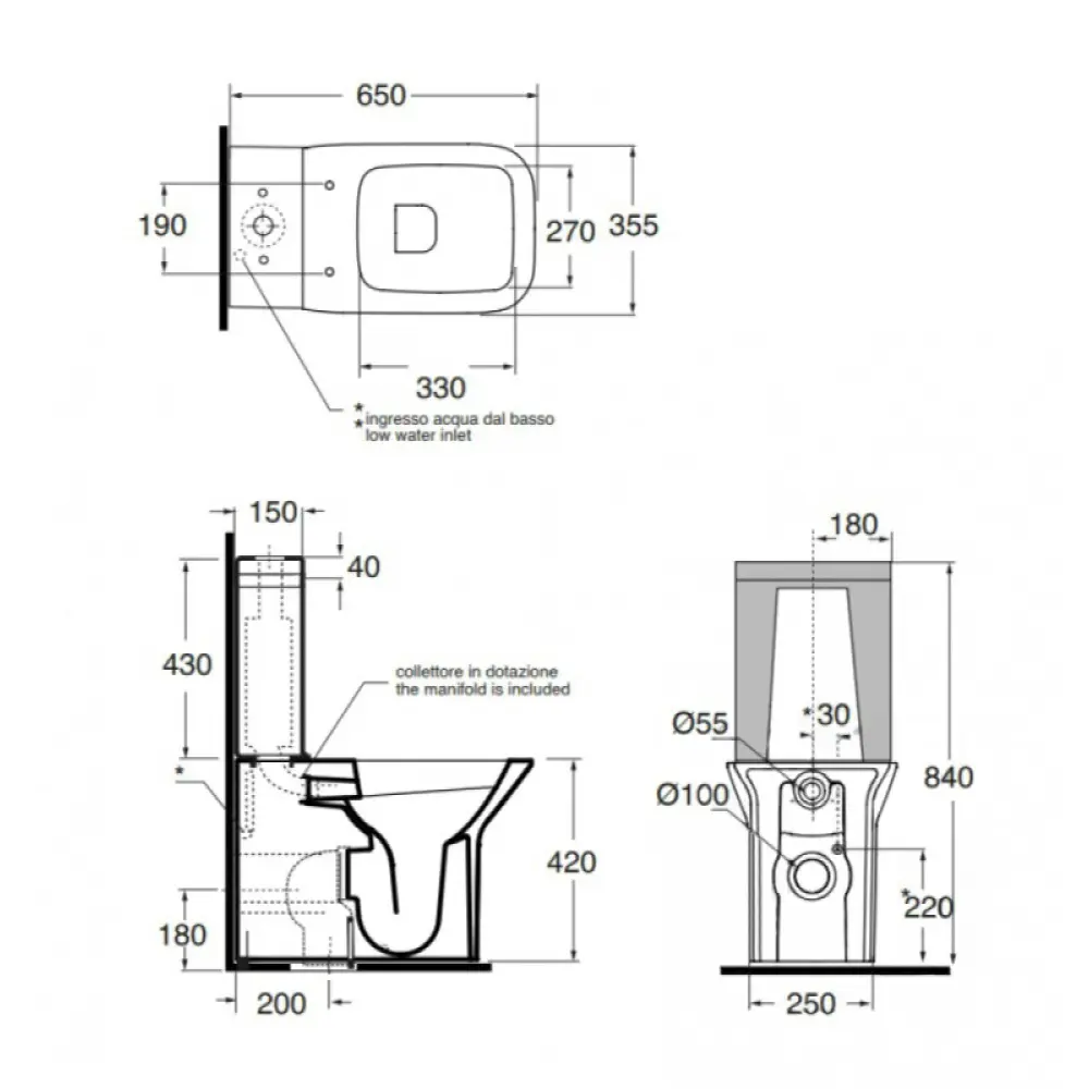 Комплект Azzurra Prua PRU100B1MBP складається з бачка з набірним та зливним механізмами, а також унітазу зі швидкознімним сідінням з системою soft-close, яка забезпечує плавне й безшумне опускання. Чаша унітаза - лійкоподібна, є ідеальним рішенням проблем вилітання бризок і поганого змивання нечистот. На бачку передбачена хромована кнопка, яка при повторному натисканні не працює, тим самим економить витрату води. Установка унітаза на підлогу не вимагає особливих зусиль.
