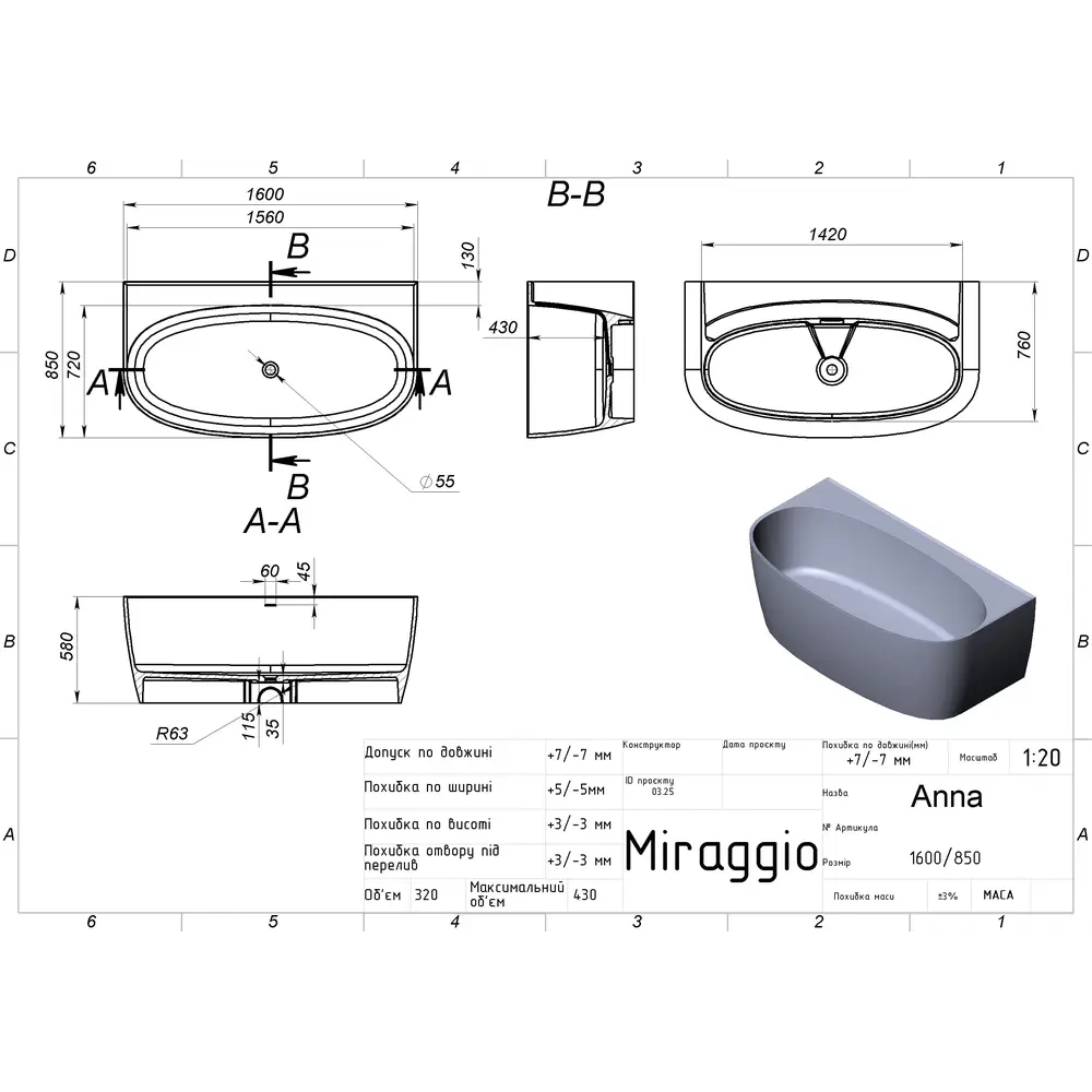 Ванна ANNA зі штучного каменю може бути пофарбована в будь-який колір за палітрою RAL. Зверніть увагу, забарвлюється тільки зовнішня поверхня виробу. Ванни з матеріалу MIRASOFT, фарбуванню не підлягають. Всі моделі ванн MIRAGGIO комплектуються сифонами фінського виробництва і мають гарантію від виробника 10 років.