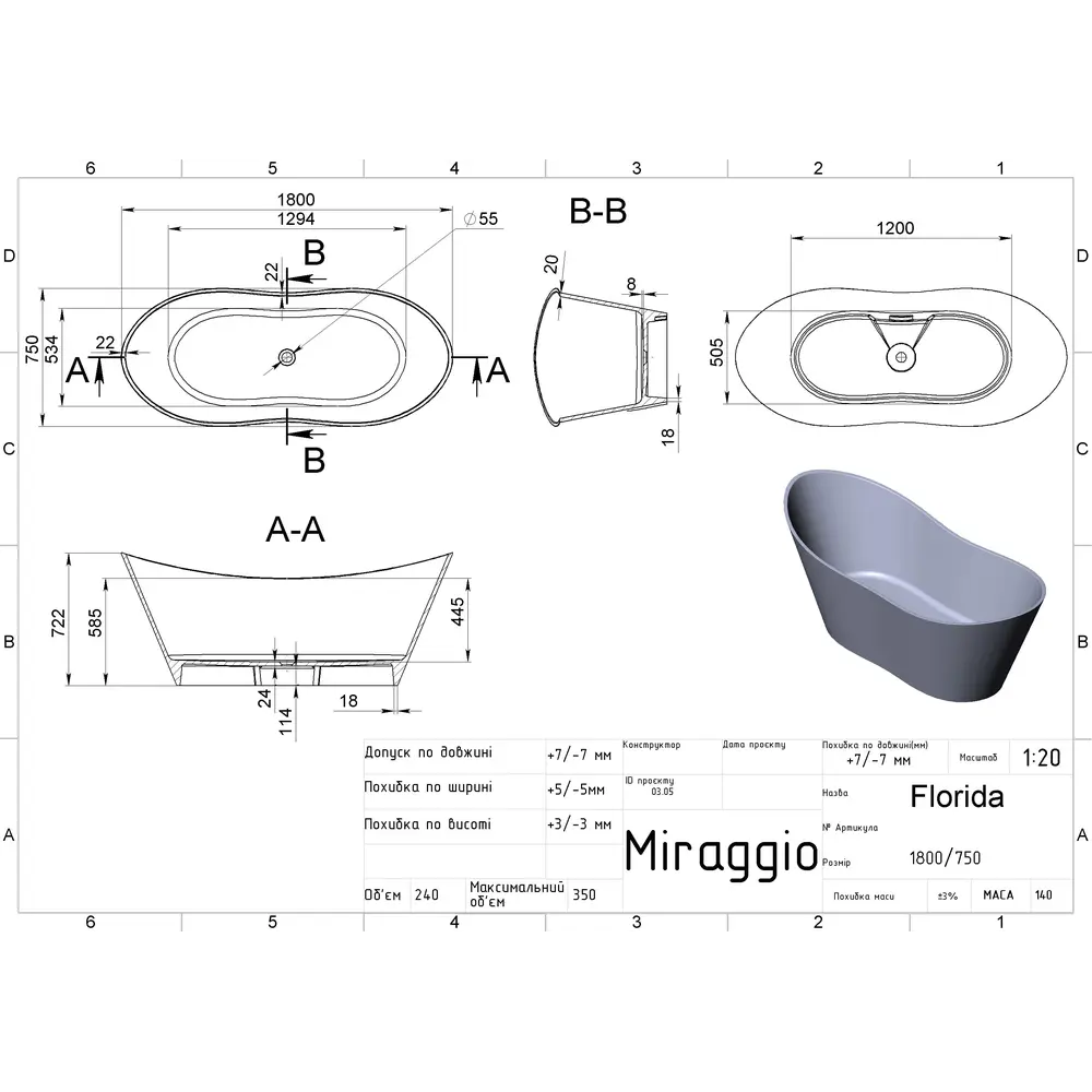 Miraggio пропонує великий вибір ванн із композитних матеріалів. Овальна;Чаша Ванна FLORIDA MIRAGGIO з матеріалу Miramarble - це досконале творіння за дизайном та функціональністю. Ванна ідеально доповнить проєкти сучасних фахівців оформлення інтер'єру. Поверхня ванни - Глянцева. Тип встановлення ванни - Окремостояча.