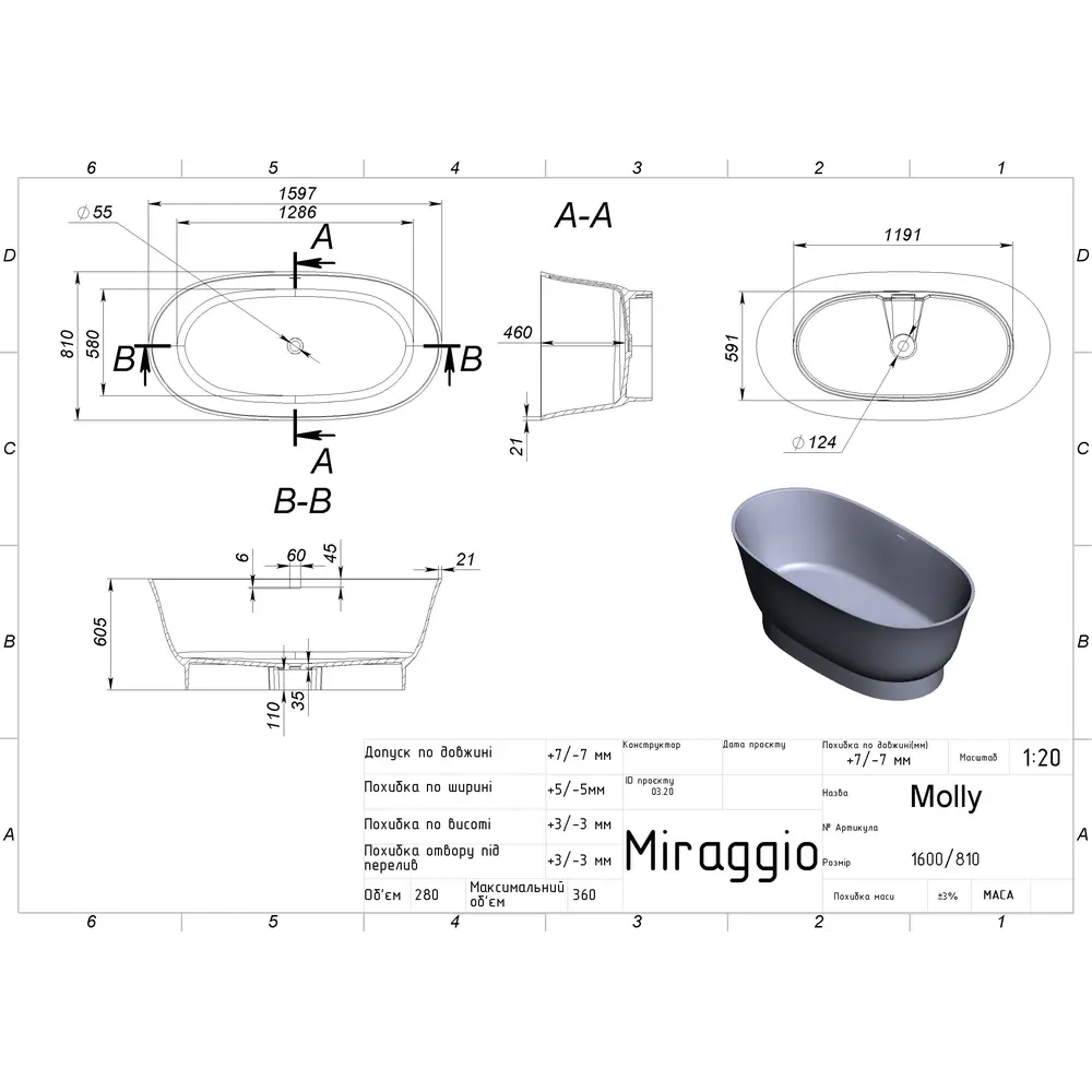 Ванна MOLLY MIRASOFT зі штучного каменю може бути пофарбована в будь-який колір за палітрою RAL. Зверніть увагу, забарвлюється тільки зовнішня поверхня виробу. Ванни з матеріалу MIRASOFT, фарбуванню не підлягають. Всі моделі ванн MIRAGGIO комплектуються сифонами фінського виробництва і мають гарантію від виробника 10 років.